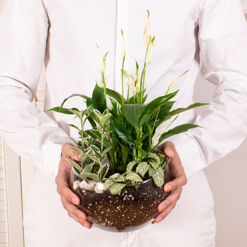 To get the most out of this plant arrangement or terrarium, please add a little water to the right of each plant whenever needed. As terrariums or plant arrangements are made in pots that do not allow excess water to drain away, the recommendation is to add water only when you see the substrate starting to dry out.