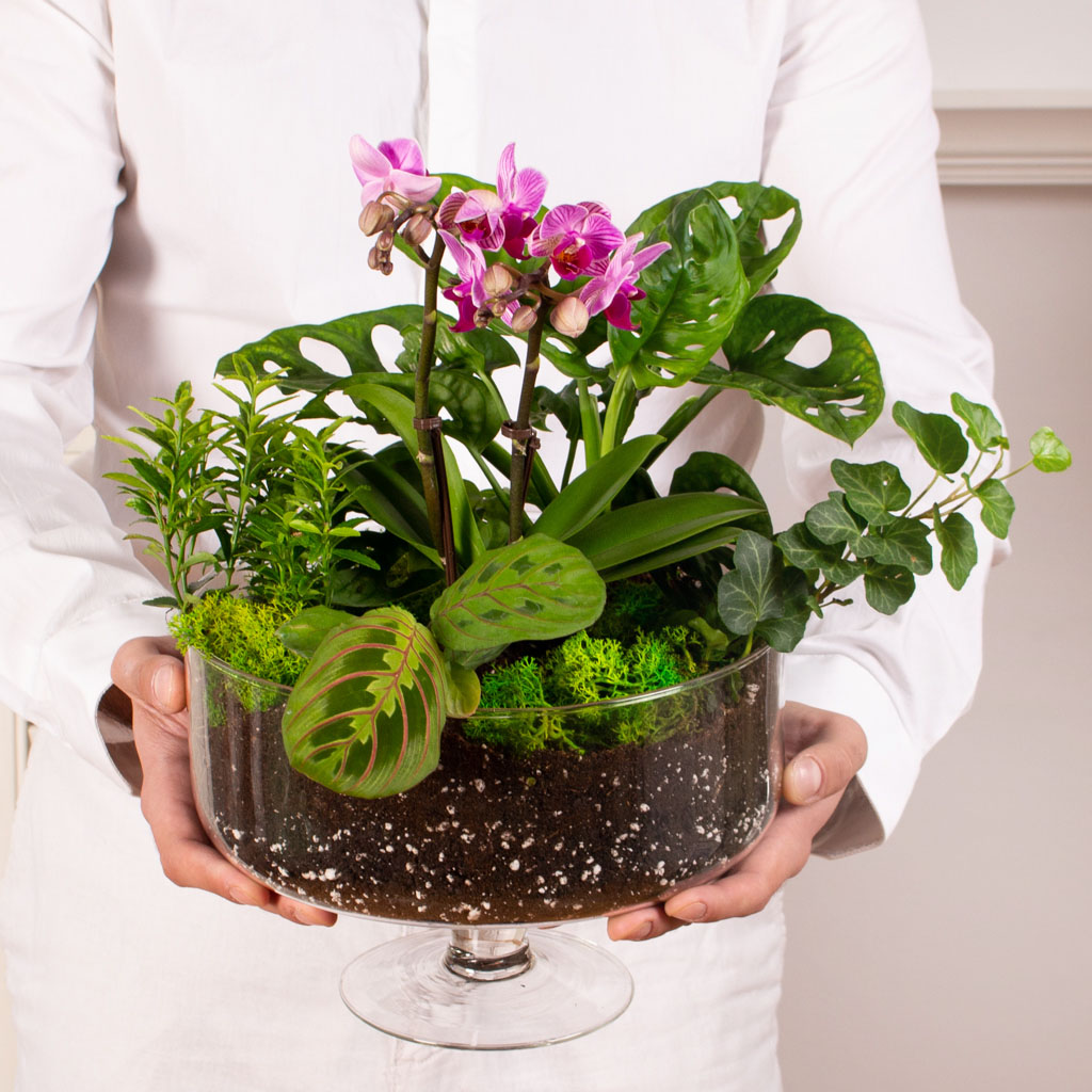 To get the most out of this plant arrangement or terrarium, please add a little water to the right of each plant whenever needed. As terrariums or plant arrangements are made in pots that do not allow excess water to drain away, the recommendation is to add water only when you see the substrate starting to dry out.