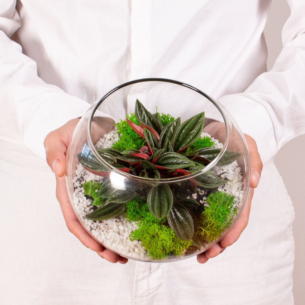 We cherish everything nature has beautiful to offer, so we’ve prepared this special terrarium with peperomia for you or someone dear. Arrangements with green plants and flowering plants last longer and, moreover, purify the air in your home or office. This terrarium is the perfect gift for plant lovers.