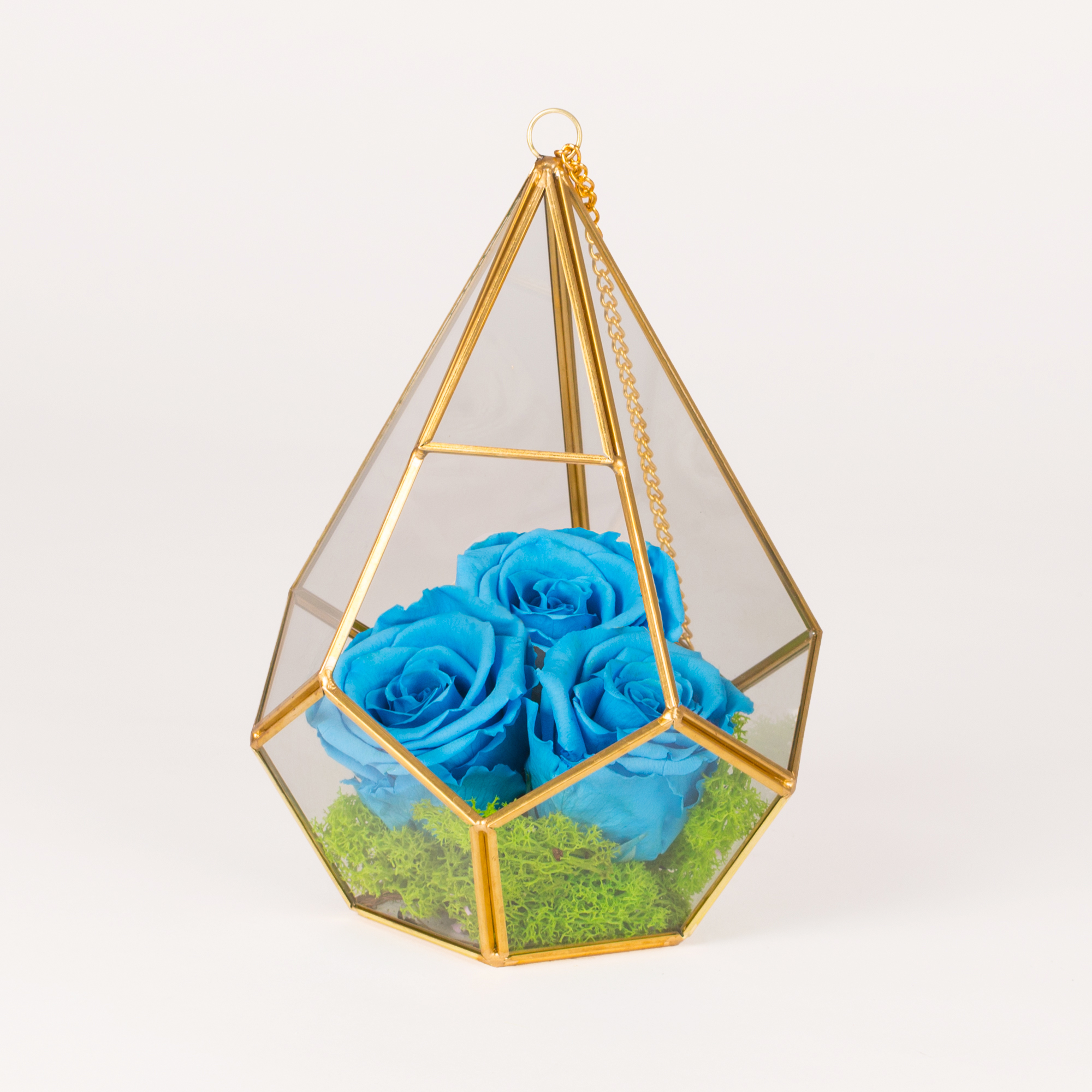 Diamond prism L15cm h23cm with 3 preserved blue roses, green moss and small nest.