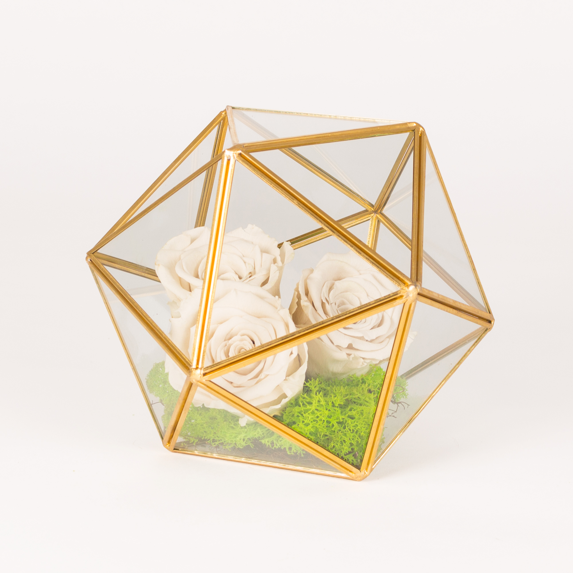 Prism sphere diam20cm with 3 preserved white roses, green moss and small nest.