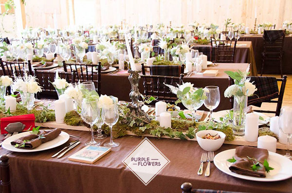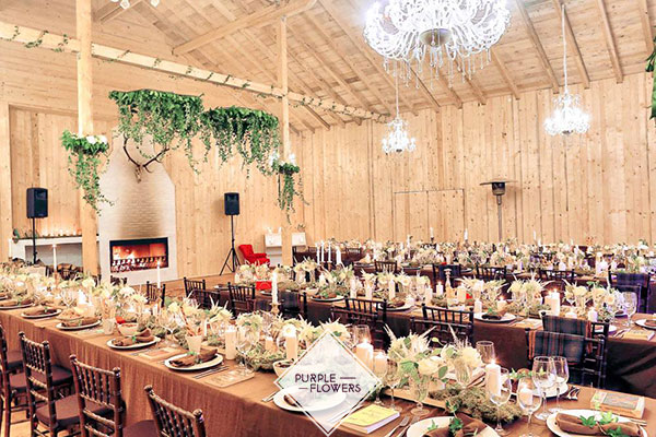 For the floral décor, we imagined simple, tasteful and elegant arrangements, inspired by Adela’s personality. Because everything was going to happen in the middle of nature, we created a very natural décor. We had rectangular tables, brown Chiavari chairs and brown tablecloths, and on the entire lengths of the tables we’ve put long wooden boards decorated with vases in different sizes, and in them, green moss, ivy leaves and white flowers (astilbe, agapanthus, roses, anthirinum, hydrangea and germini). We chose to bring the nature inside through the suspended candelabras, made out of ivy and eucalyptus. We then decorated the tables with candles and we dressed the wooden pillars of the barn in all sorts of greeneries and ivy – this would become the leitmotiv of the entire wedding.