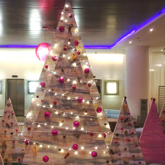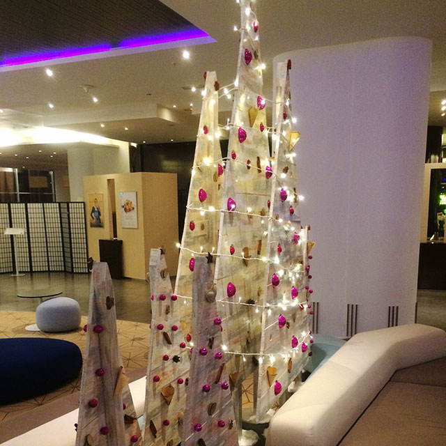 Refreshed after our Spa visit, we started working on another Christmas decor. This time, it was a minimalist one. Our second story starts at the Novotel Hotel, on Calea Victoriei. If you haven’t seen their new lobby yet, you should definitely pay a visit. The modern space and the minimalist furniture required an adequate Christmas atmosphere. It really is impossible to get bored with this job! I was thinking about the idea of a fantastic-minimalist forest for Christmas, and the folks at Novotel loved it. So the result was a conceptual forest in magenta and white tones, with fir trees made out of wood and decorated with globes and traditional Christmas lights. It was madness!