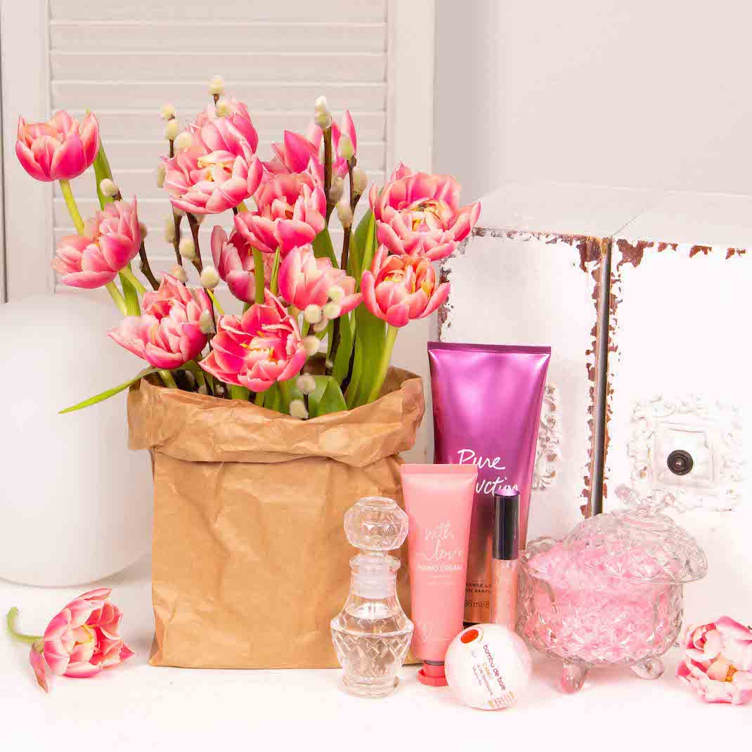 Gift with tulips, relaxing oil, bath bomb, bath salt, body lotion, lipgloss and a hand cream