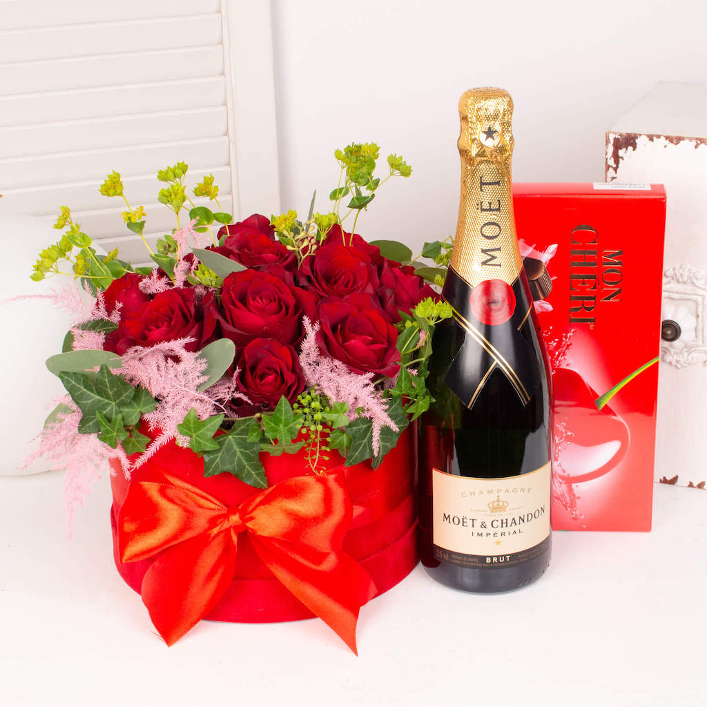 The most special occasions need beautiful gifts. And we couldn’t let Valentine’s Day pass without doing one. Order this gift with red roses, Moet champagne and chocolate pralines and turn this evening into a memorable one.