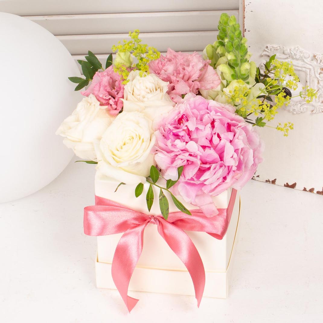 Ivory box with pink peony, 3 white roses, pink lisianthus, greenery and other flowers.