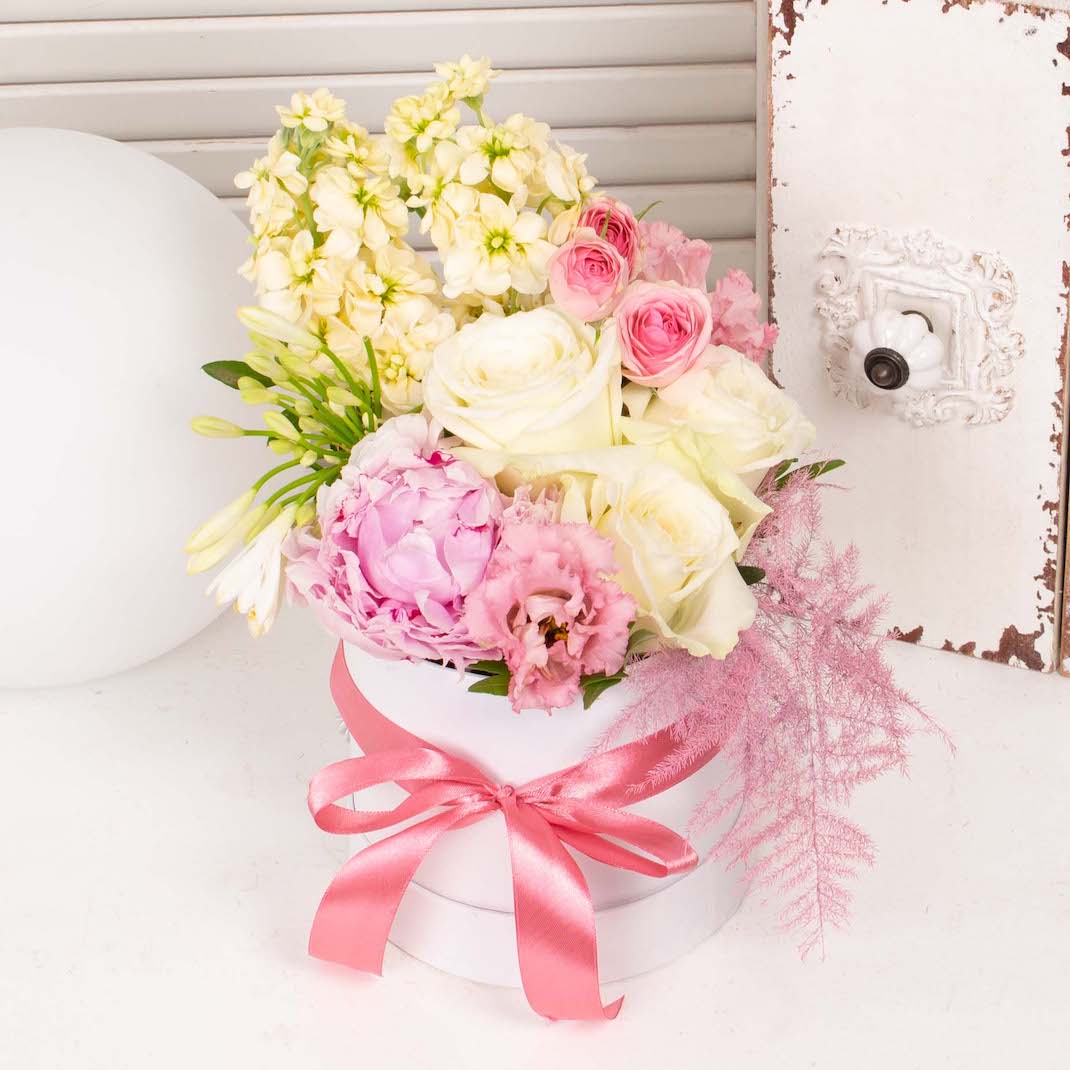Express your feelings in flowers and offer this box with white roses, peony, matthiola and other flowers to your loved one. These flowers will brighten the day of your wife, mother, girlfriend, colleague or boss! Add your personalised message and we’ll start surprising her right away with this special arrangement.