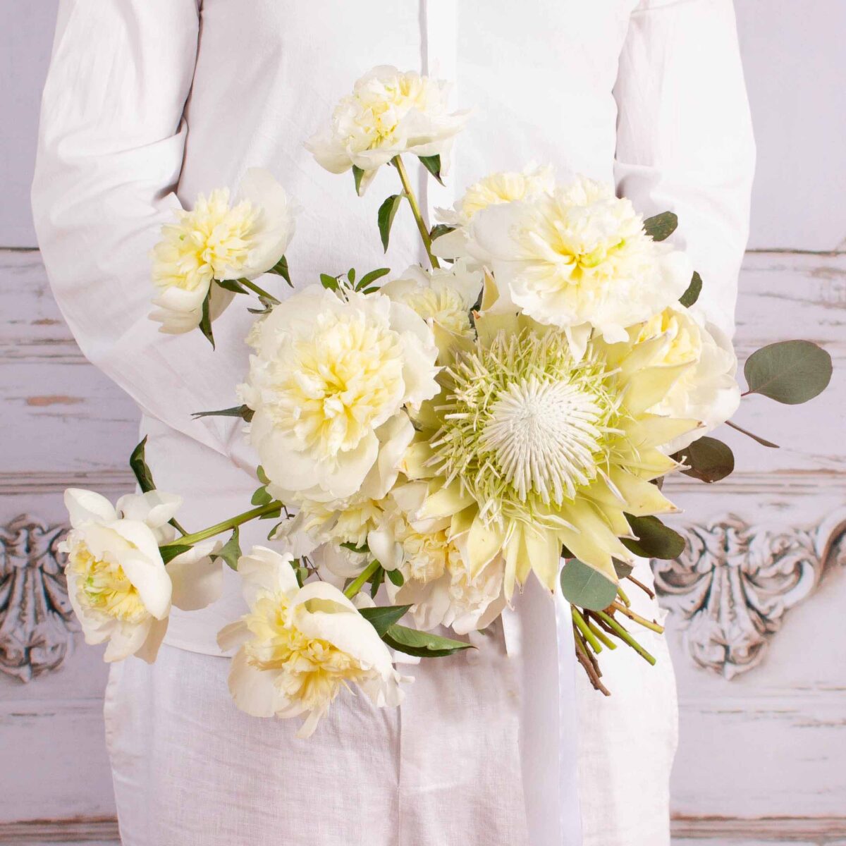 Flowers bring happiness to the people. This Bouquet of protea and peonies will be a beautiful surprise to anyone. For sure this bouquet made by our florists at the Purple Flowers online Flower Shop can transform a regular day into a memorable one. Add your special message to the flowers and we will deliver it as soon as possible. There is no better way of saying „I love you!”, „Happy Birthday!” or „Congratulations!” than with a bouquet of flowers.
