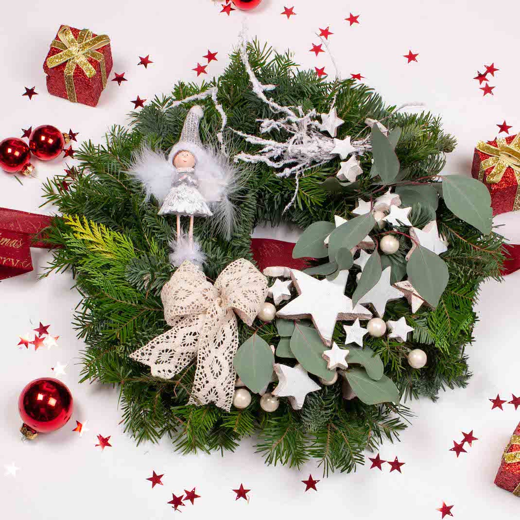 The wreath from the picture (some decorations may be slightly different) in a gift box with a bow
