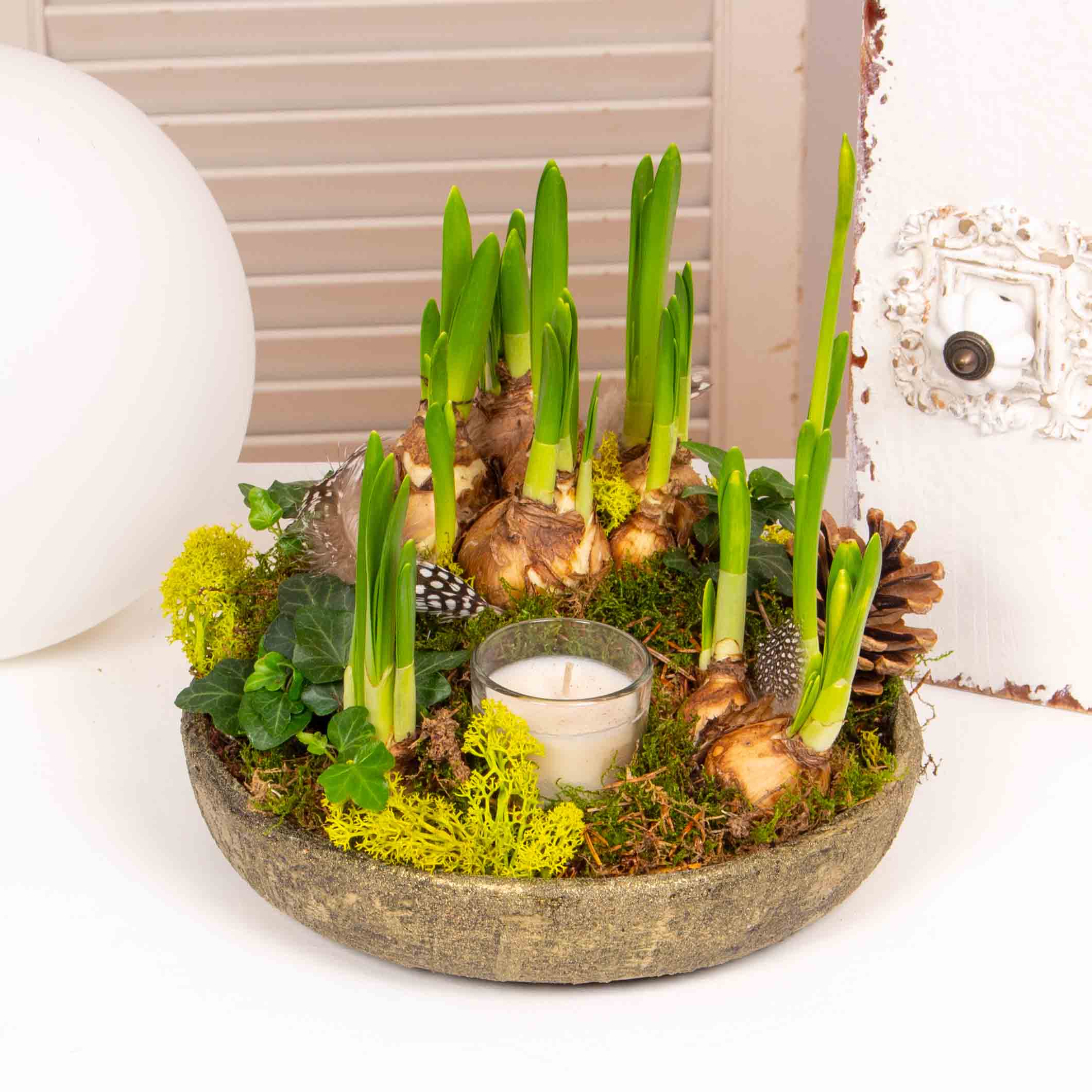 Aranjament in farfurie ceramica cu 7 bulbi de narcisa, muschi verde, iedera, con de pin uscat, pene, 1 lumanare.