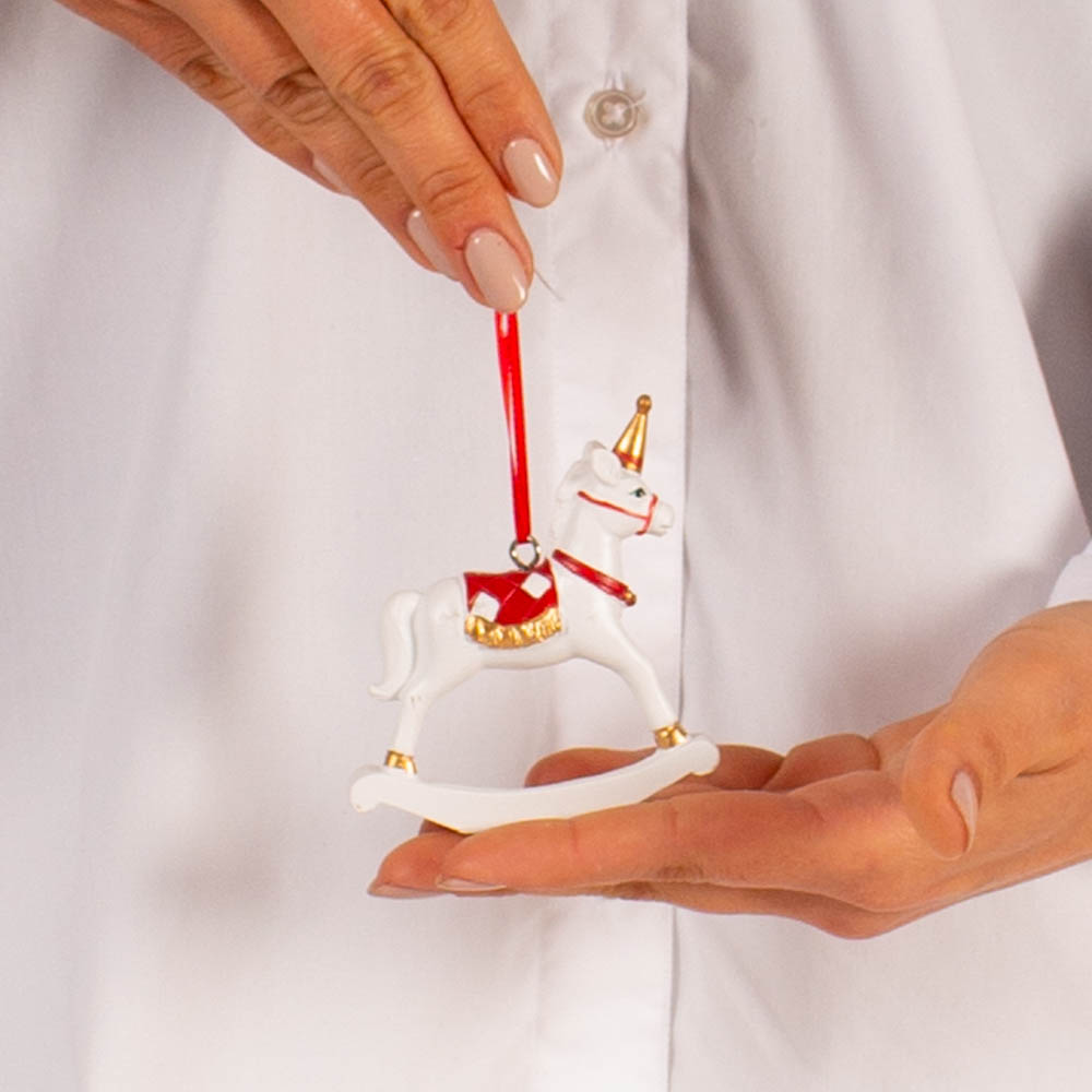 Contine : Figurina Cal balansoar cu agatatoare din rasina 6,5 x 3 x 9 cm, alb rosu