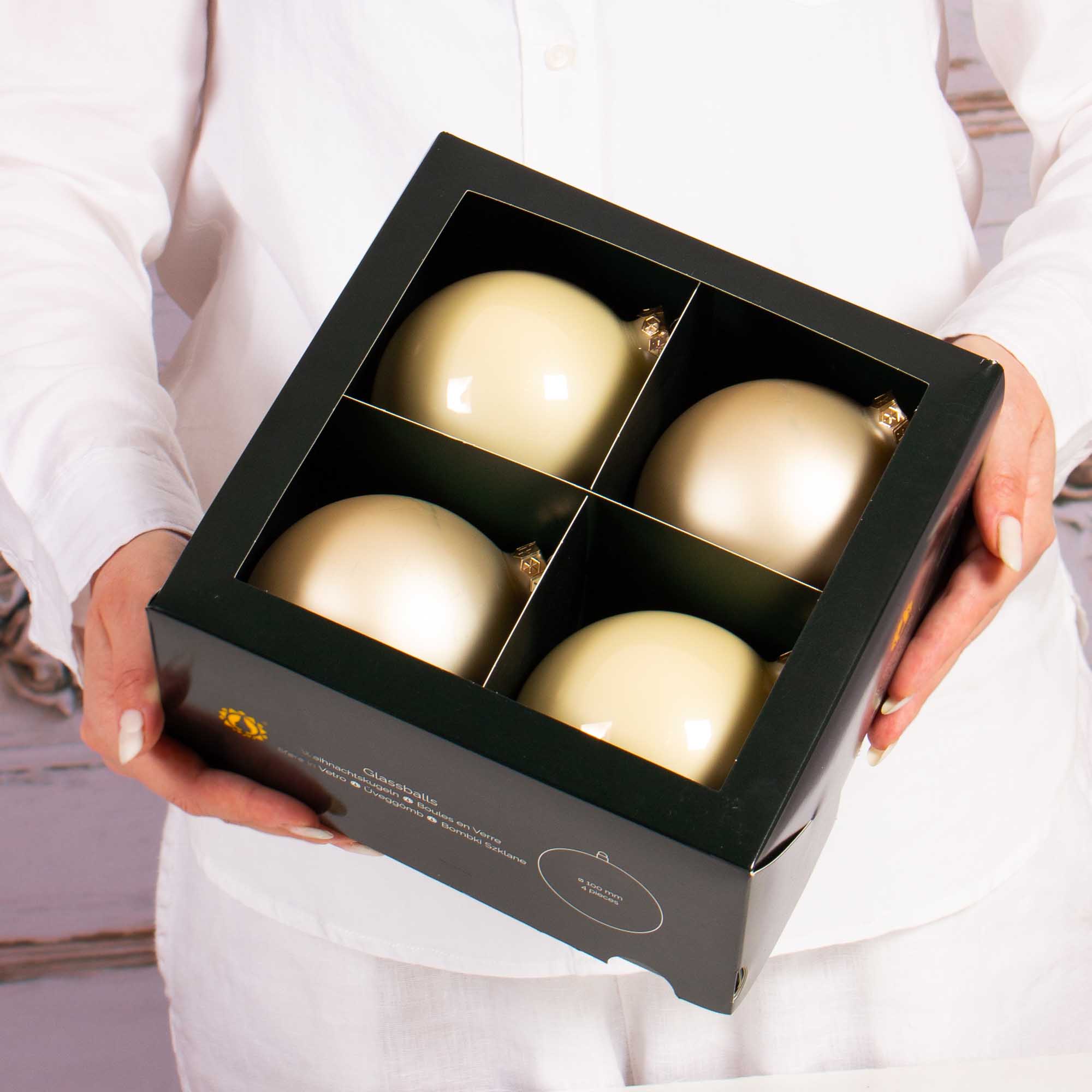 Contine: Globuri de sticla 10 cm, crem auriu, lucios si mat, set 4 buc