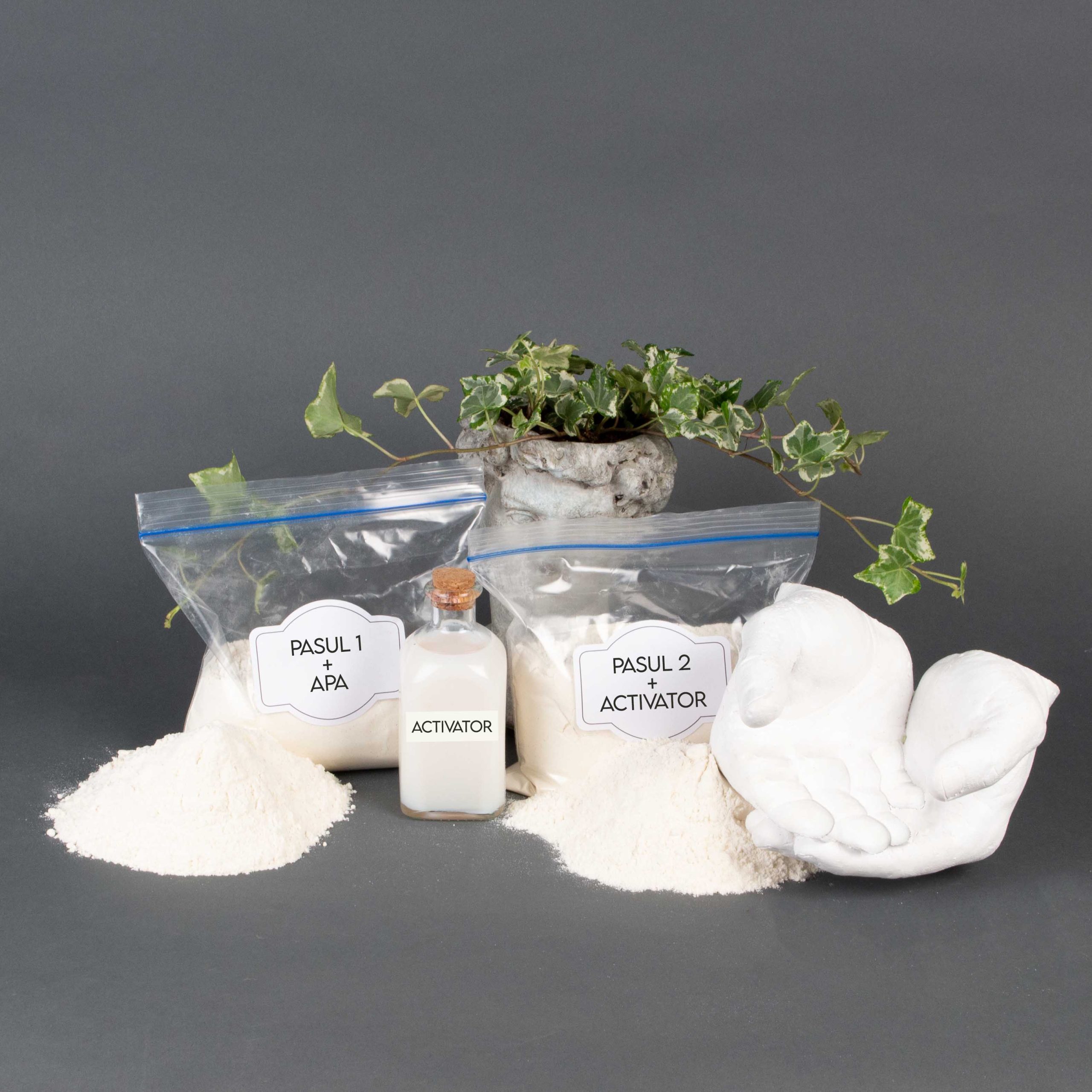 PASUL 1 presupune realizarea unei matrite 1:1 din silicon ALGINATE. Pudra Alginate este obtinuta din alge marine si poate fi folosita fara contraindicatii in contact cu pielea. Aceasta se amesteca, cu ajutorul unui mixer, cu apa, pana se obtine o pasta omogena (asemanatoare aluatului pentru clatite). In acest moment trebuie sa iti bagi mana in aceasta pasta si sa stai nemiscat cateva minute (maxim 10 minute) pana cand siliconul se intareste. Apoi trebuie sa iti scoti usor mana din matrita (poti sa folosesti o crema de maini cu o consistenta mai grasa, inainte de a baga mana in silicon) incercand sa nu strici matrita. PASUL 2 este si mai simplu. Pudra Acrilica se amesteca cu lichidul Activator, tot cu ajutorul unui mixer. Se recomanda ca lichidul Activator sa fie amestecat intr-un recipient cu mixerul, iar pudra sa fie adaugata treptat. Cand compozitia devine omogena se toarna usor in matrita de silicon si apoi se asteapta minim o ora pentru ca rasina Acrilica sa se intareasca. Este normal ca matrita de silicon sa fie umeda. Extragerea mulajului din matrita se face distrugand matrita. Acest tip de silicon poate fi folosit pentru o singura turnare. Dupa ce mulajul din rasina Acrilica se usuca complet, acesta va avea textura unui mulaj de ipsos, dar va fi alb si va fi mult mai rezistent in timp.