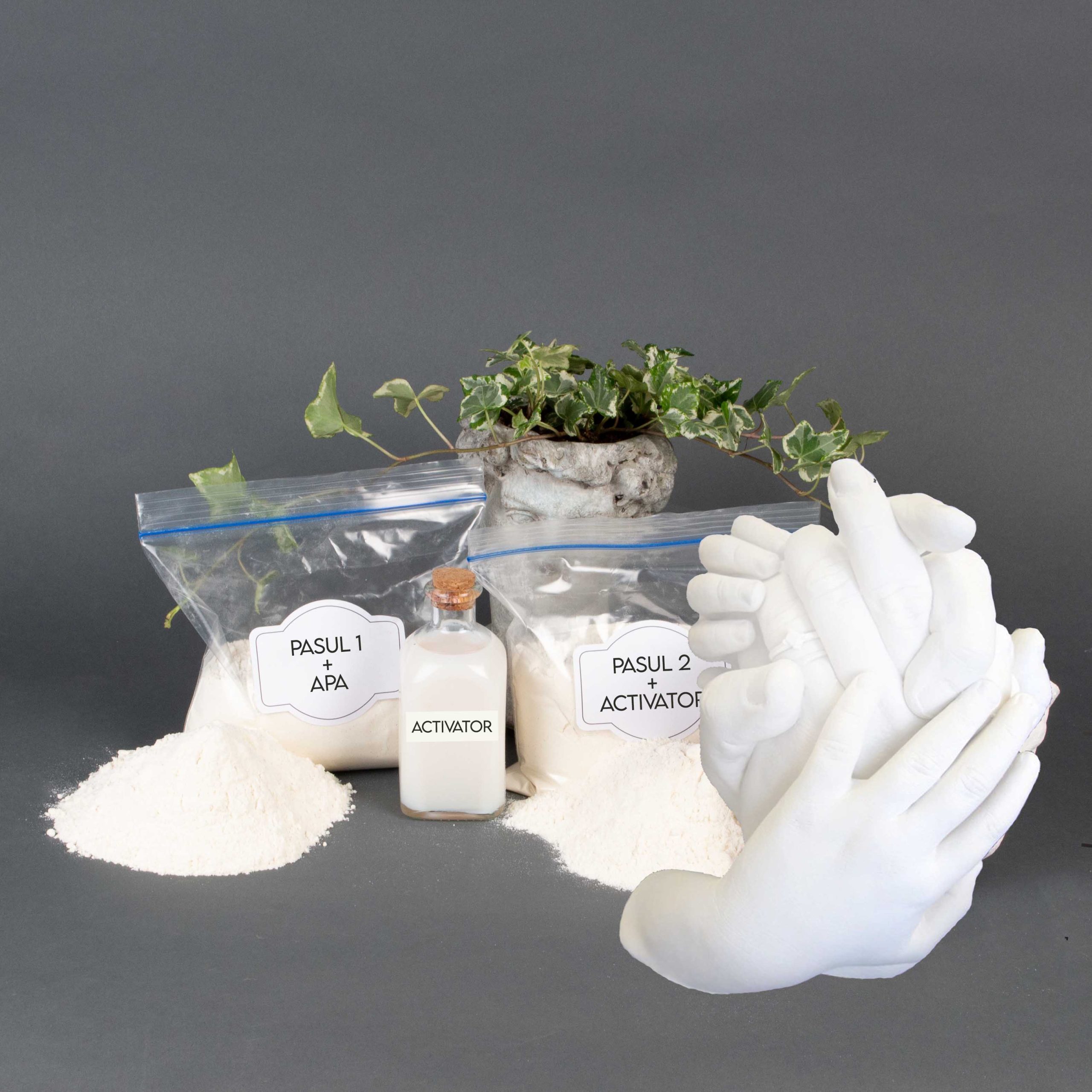 PASUL 1 presupune realizarea unei matrite 1:1 din silicon ALGINATE. Pudra Alginate este obtinuta din alge marine si poate fi folosita fara contraindicatii in contact cu pielea. Aceasta se amesteca, cu ajutorul unui mixer, cu apa, pana se obtine o pasta omogena (asemanatoare aluatului pentru clatite). In acest moment trebuie sa iti bagi mana in aceasta pasta si sa stai nemiscat cateva minute (maxim 10 minute) pana cand siliconul se intareste. Apoi trebuie sa iti scoti usor mana din matrita (poti sa folosesti o crema de maini cu o consistenta mai grasa, inainte de a baga mana in silicon) incercand sa nu strici matrita. PASUL 2 este si mai simplu. Pudra Acrilica se amesteca cu lichidul Activator, tot cu ajutorul unui mixer. Se recomanda ca lichidul Activator sa fie amestecat intr-un recipient cu mixerul, iar pudra sa fie adaugata treptat. Cand compozitia devine omogena se toarna usor in matrita de silicon si apoi se asteapta minim o ora pentru ca rasina Acrilica sa se intareasca. Este normal ca matrita de silicon sa fie umeda. Extragerea mulajului din matrita se face distrugand matrita. Acest tip de silicon poate fi folosit pentru o singura turnare. Dupa ce mulajul din rasina Acrilica se usuca complet, acesta va avea textura unui mulaj de ipsos, dar va fi alb si va fi mult mai rezistent in timp.