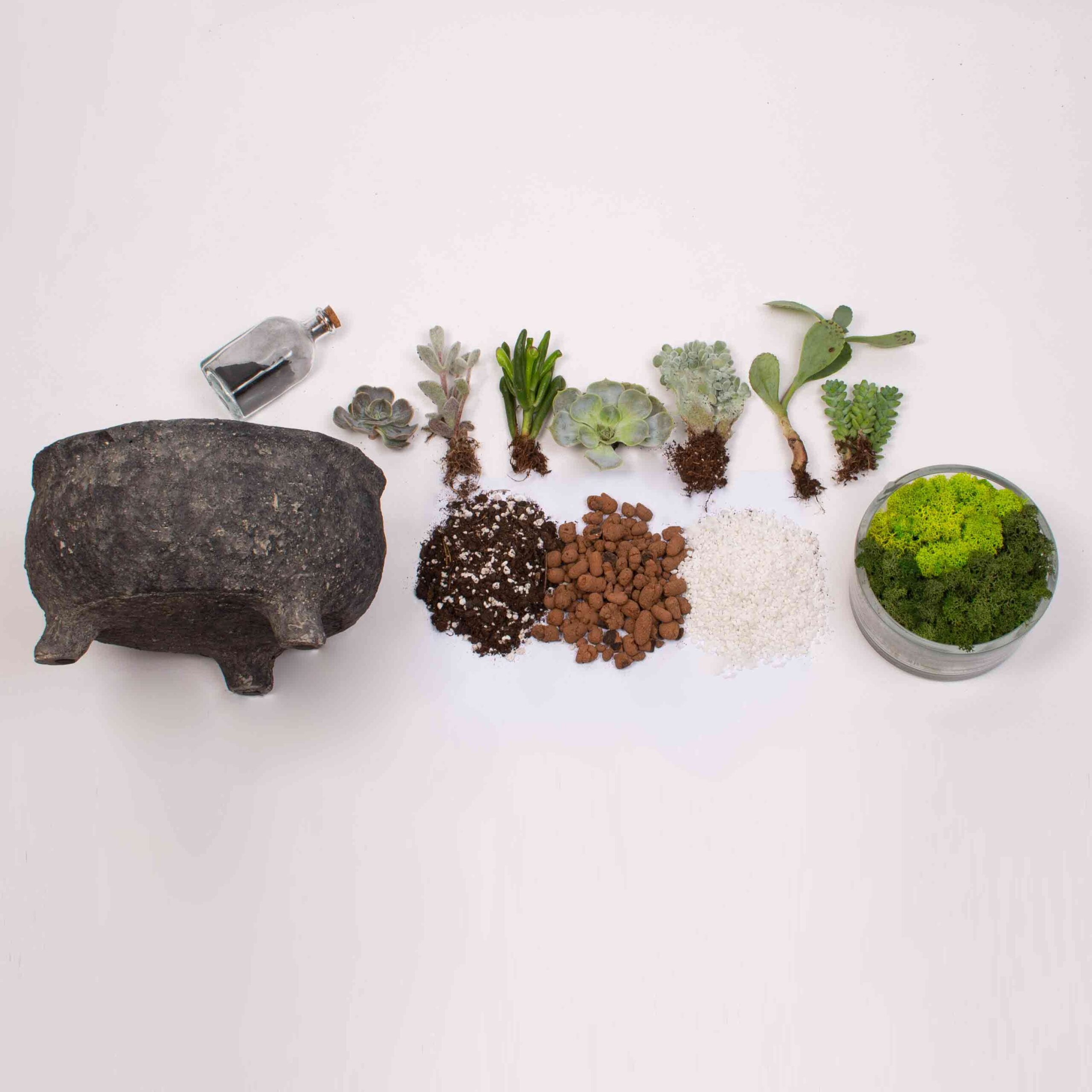 Vas ceramic, pietre ceramice, paman, pietre decorative, muschi verde, carbune activ si 7 plante suculente.