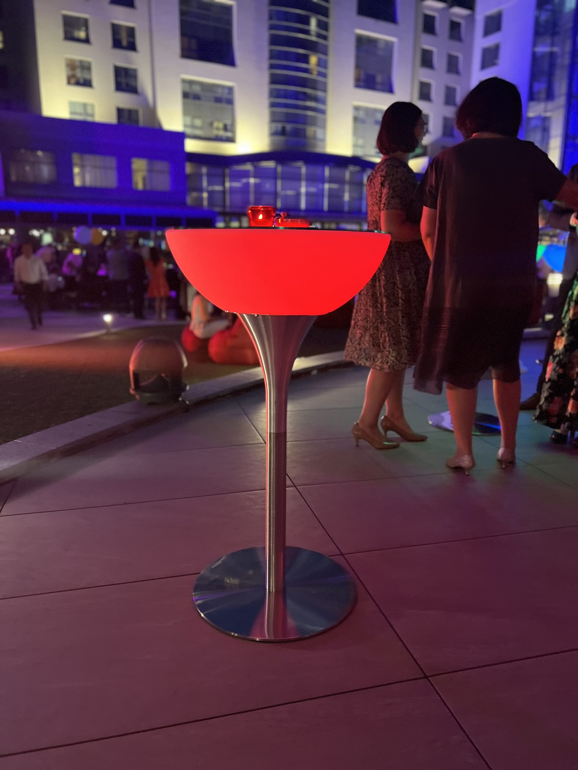 Aceasta masa de cocktail este ideala pentru evenimente in aer liber, petreceri de club, nunti moderne sau evenimente corporate. Ofera un spatiu practic pentru servirea bauturilor, in timp ce ilumineaza spatiul cu un joc de lumini care va impresiona cu siguranta invitatii.