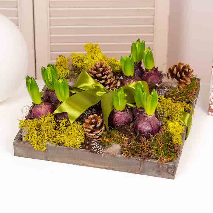 Aranjament in tavita de lemn cu 9 bulbi de zambila, muschi verde si alte elemente de decor.
