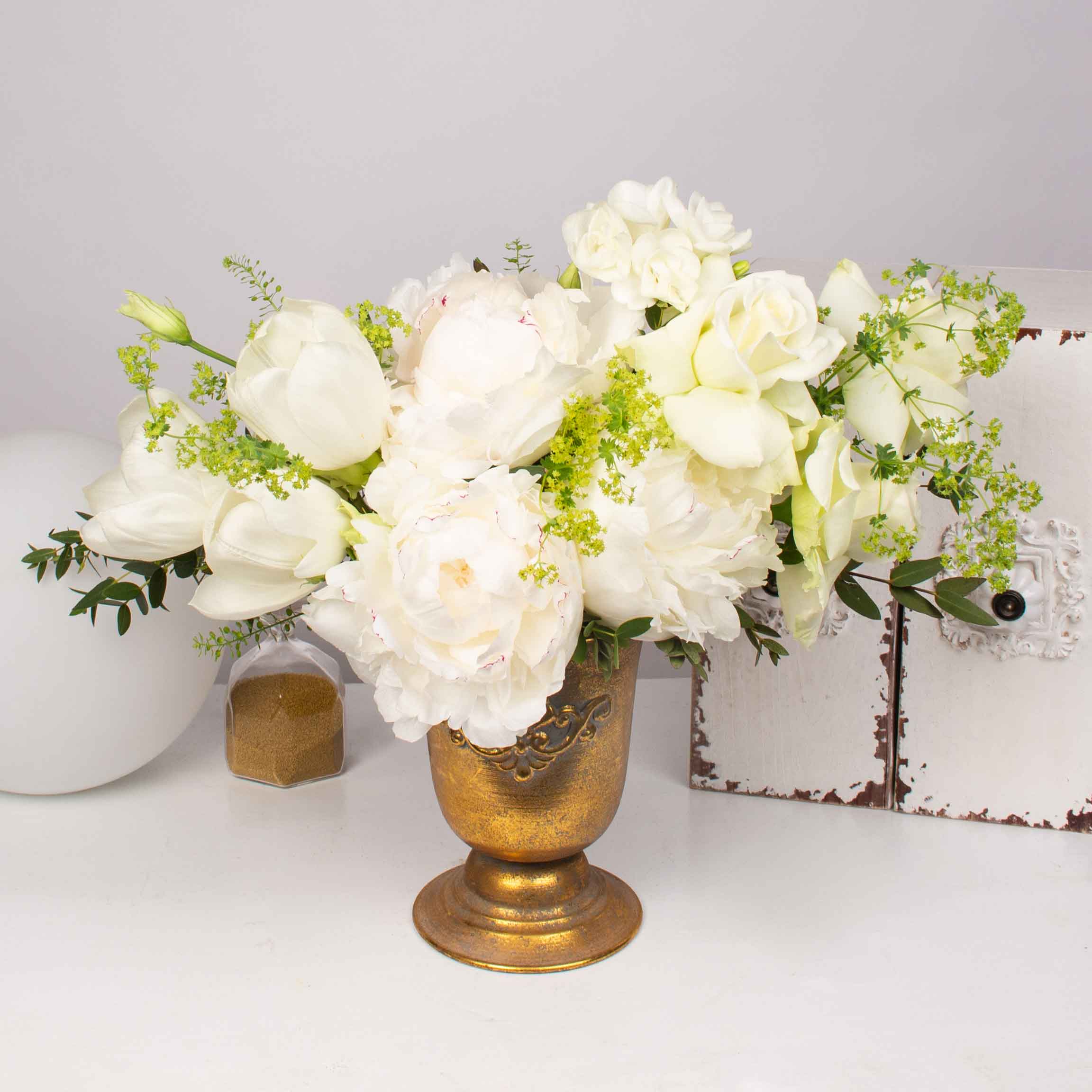 Urna aurie cu 3 bujori albi, 3 lalele albe, 3 trandafiri albi, verdeata si alte flori de decor.