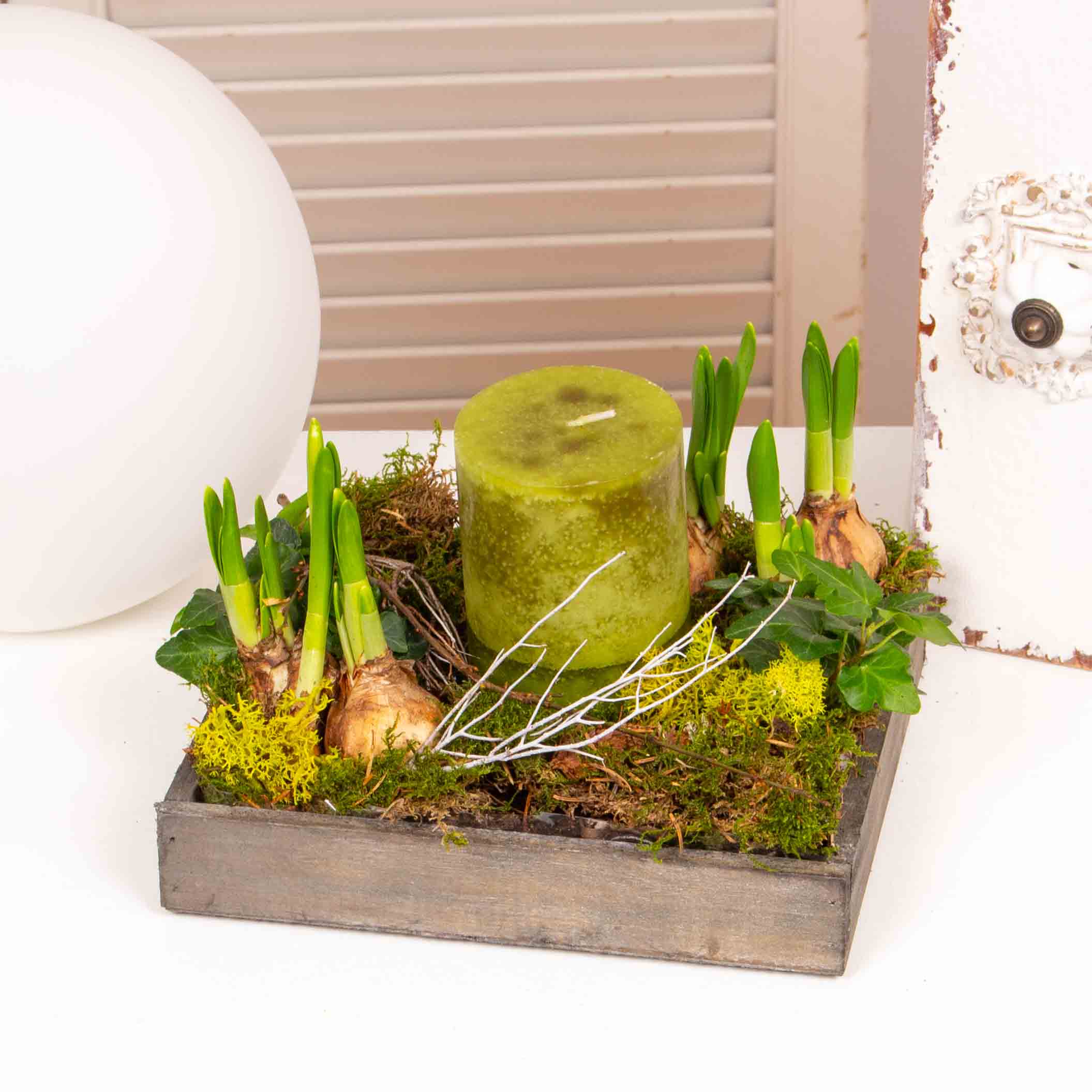 Aranjament in tavita de lemn cu 6 bulbi de narcisa, muschi verde, lumanare parfumata.