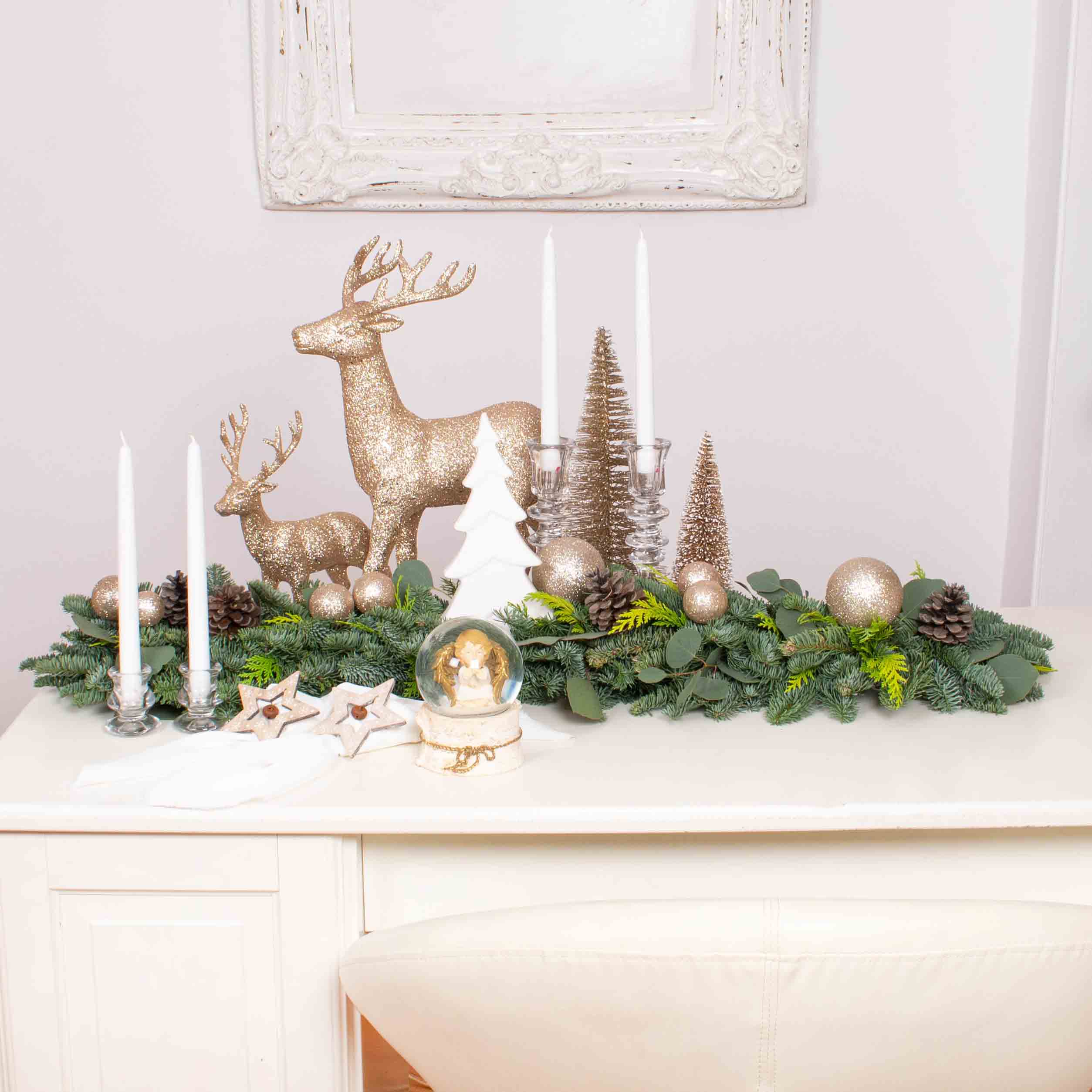 Ghirlanda de 2 persoane, 2 globuri mari aurii, 6 globuri medii aurii, 6 conuri de pin uscate, 2 sfesnice mici de sticla, 2 sfesnice mari de sticla, 2 servete de panza albe, 2 servete, 4 lumanari si alte elemente de decor.
