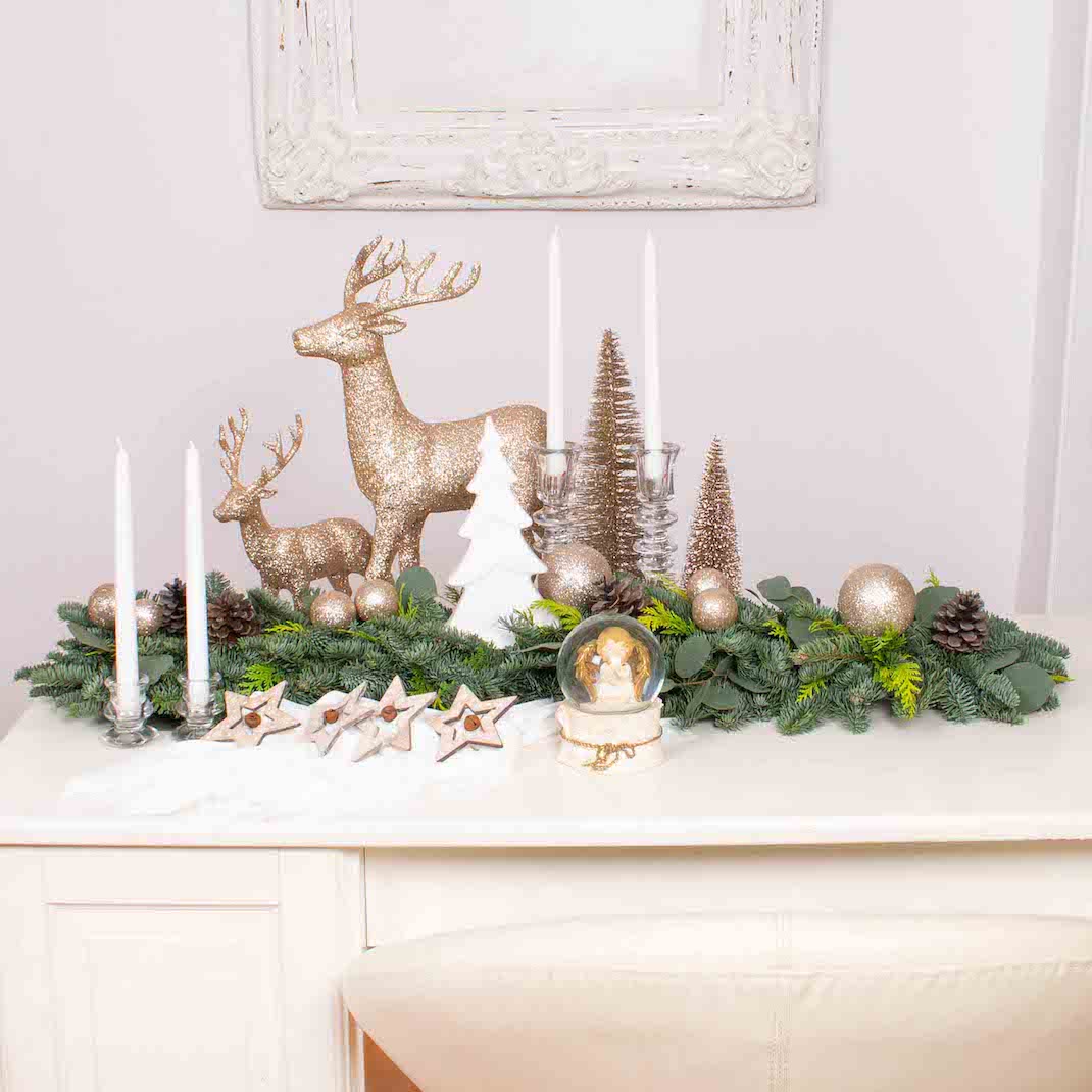 Ghirlanda de 4 persoane, 2 globuri mari aurii, 6 globuri medii aurii, 8 conuri de pin uscate, 2 sfesnice de sticla mari, 2 sfesnice de sticla mici, 4 servete, 4 servete de panza albe si alte elemente de decor.