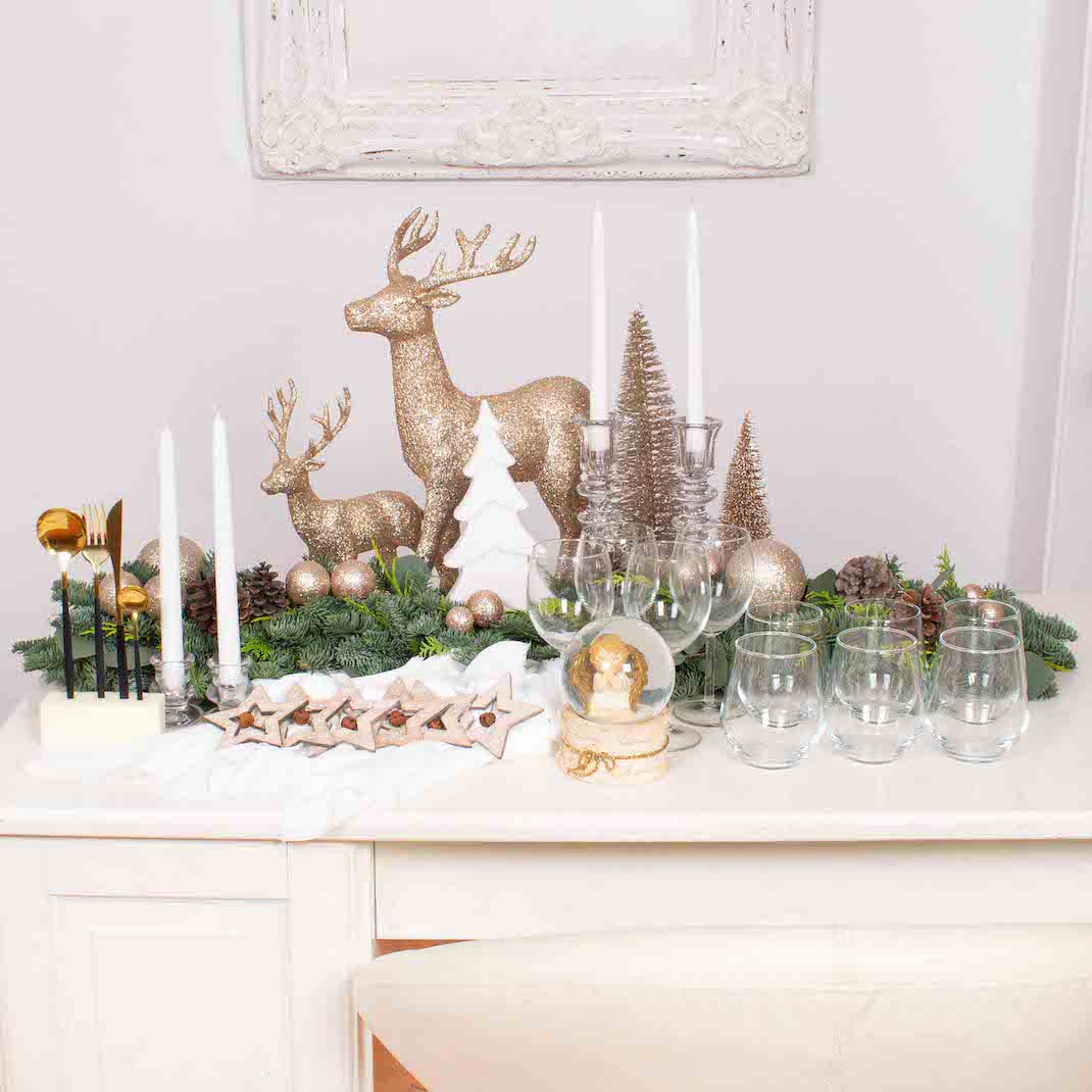 Ghirlanda 6 persoane, 2 globuri mari aurii, 6 globuri medii aurii, 10 conuri de pin uscate, 6 servete, 6 pahare de vin, 6 pahare de apa, 24 de tacamuri, 6 servete de panza alba, 2 sfesnice mici de sticla, 2 sfesnice mari de sticla, 4 lumanari si alte elemente de decor.