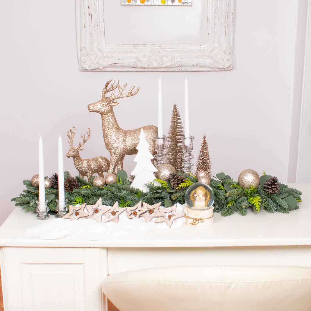 Ghirlanda 6 persoane, 2 globuri mari aurii, 6 globuri medii aurii, 10 conuri de pin uscate, 6 servete de panza albe, 6 servete, 2 sfesnice mici de sticla, 2 sfesnice mari de sticla, 4 lumanari albe si alte elemente de decor.