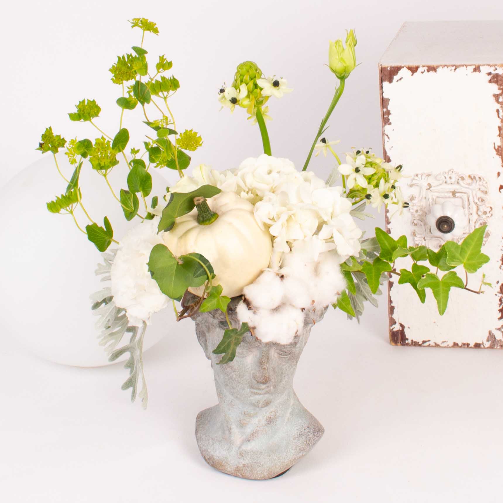 Aranjament in vaza antichizata cu hortensia alba, 2 cupe de bumbac, lisianthus alb, verdeata si alte flori de decor.