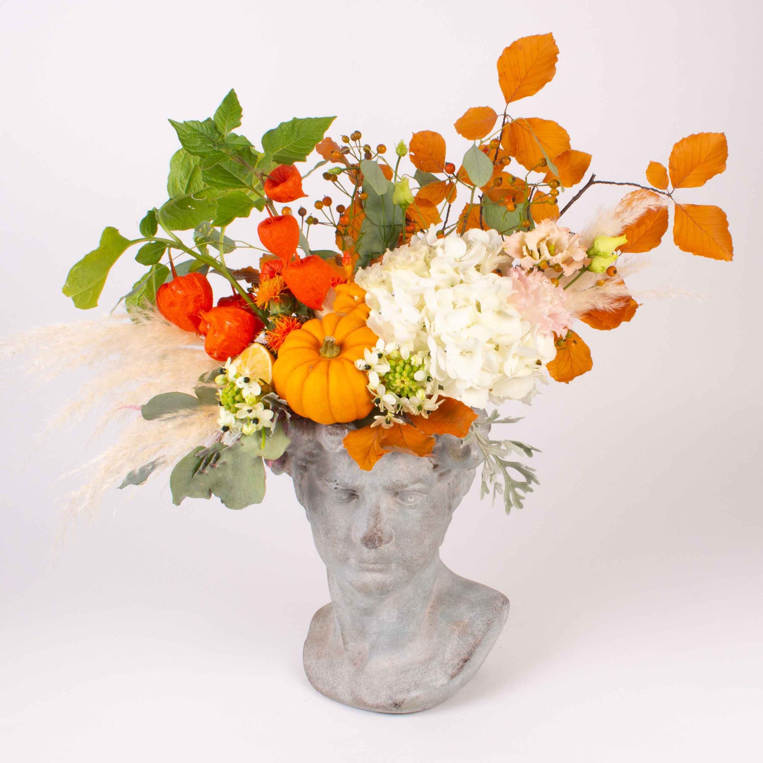 Aranjament in vaza antichizata cu hortensia alba, bostan mic portocaliu, lamaie, lisianthus roz, verdeata si alte flori de decor.