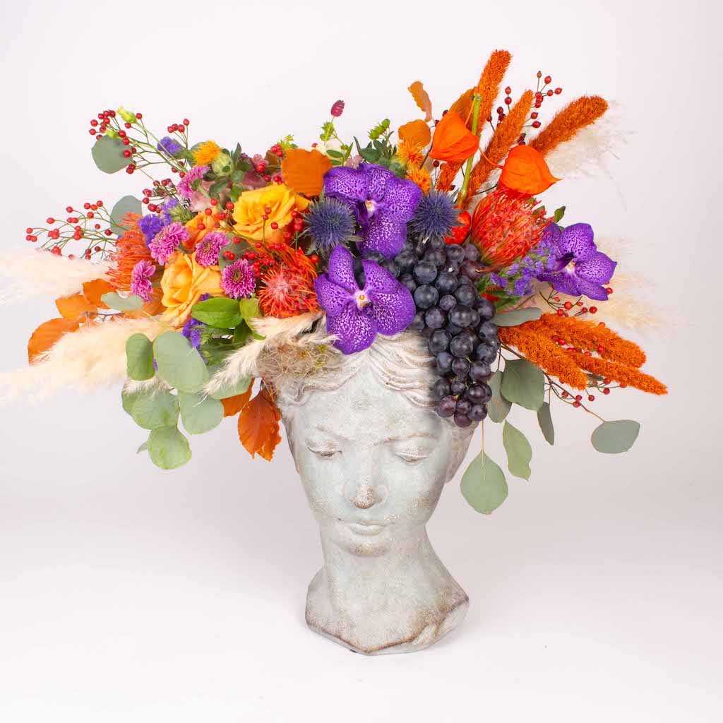 Iubim emotiile si bucuria pe care le vedem pe chipul celor care primesc flori si aranjamente florale pregatite in floraria Purple Flowers. De aceea ne straduim de fiecare data sa cream aranjamente unice care sa surprinda prin forma si culoare. Acest aranjament cu struguri si alte flori de toamna este cadoul de care ai nevoie atunci cand vrei sa spui „Te iubesc!” unei persoane dragi.