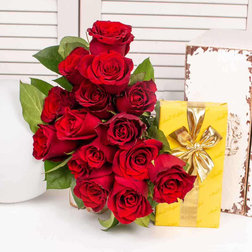 Contine:praline din ciocolata belgiana, 15 trandafiri rosii si verdeata de decor.