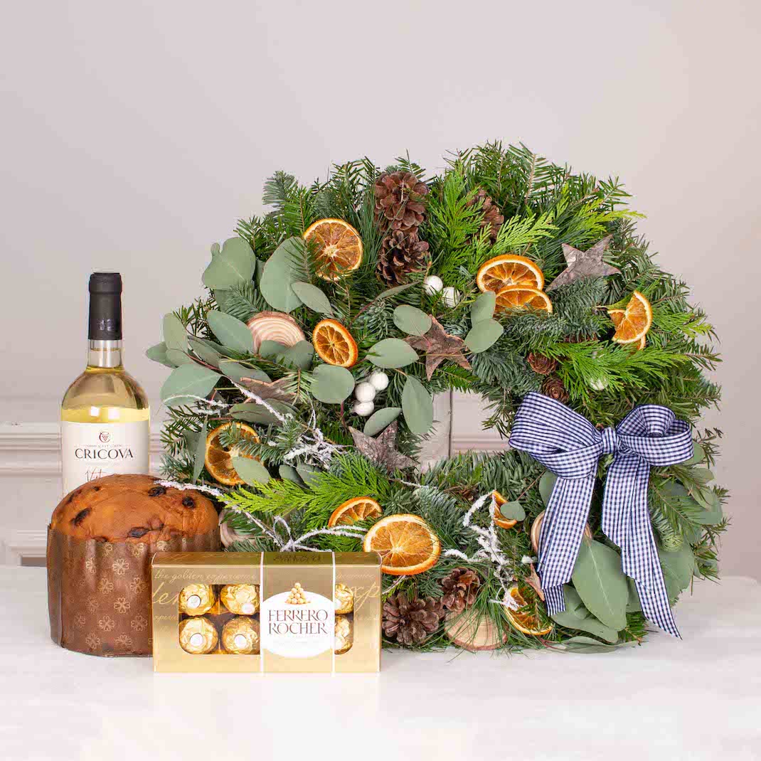 Cele mai speciale ocazii au nevoie de cadouri pe masura. Transforma o petrecere intr-o amintire frumoasa cu acest cos cadou cu Coronita de Craciun cu portocale si eucalipt, vin alb, Panetone si bomboane. Cel mai frumos moment este acela in care ne oferim cadouri, in care daruim zambete celor dragi.