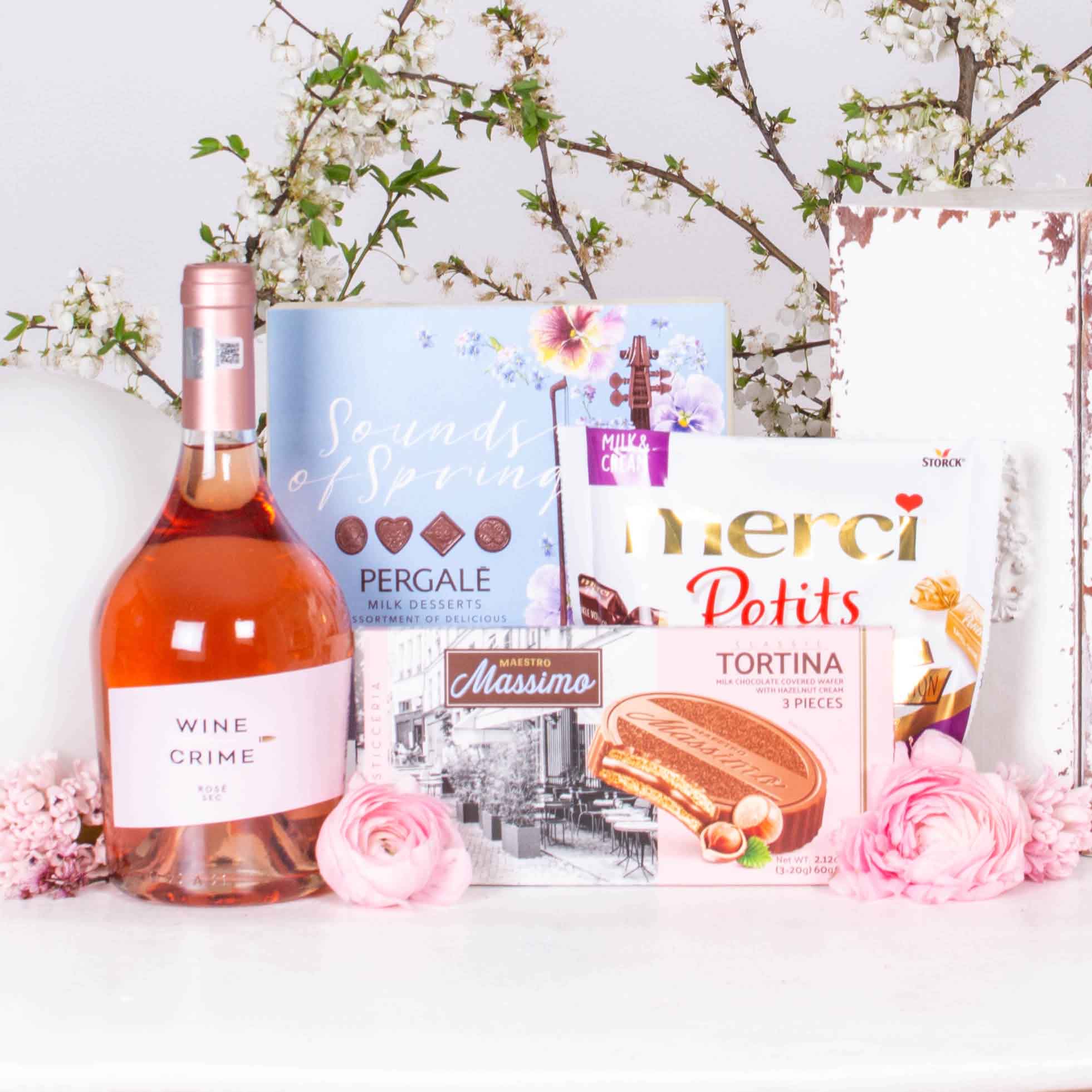 Cadou cu bomboane Pergale cu ciocolata cu lapte, napolitana Massimo, bomboane Merci Petits si vin
