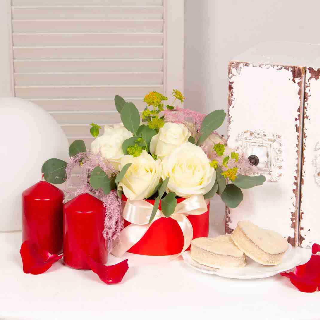 Acest cadou contine o cutie rosie cu 7 trandafiri albi, prajituri cu ciocolata alba si fulgi de cocos Adore, lumanari rosii.