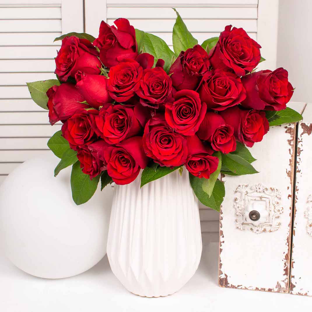 Buchet cu 19 trandafiri rosii si verdeata de decor.