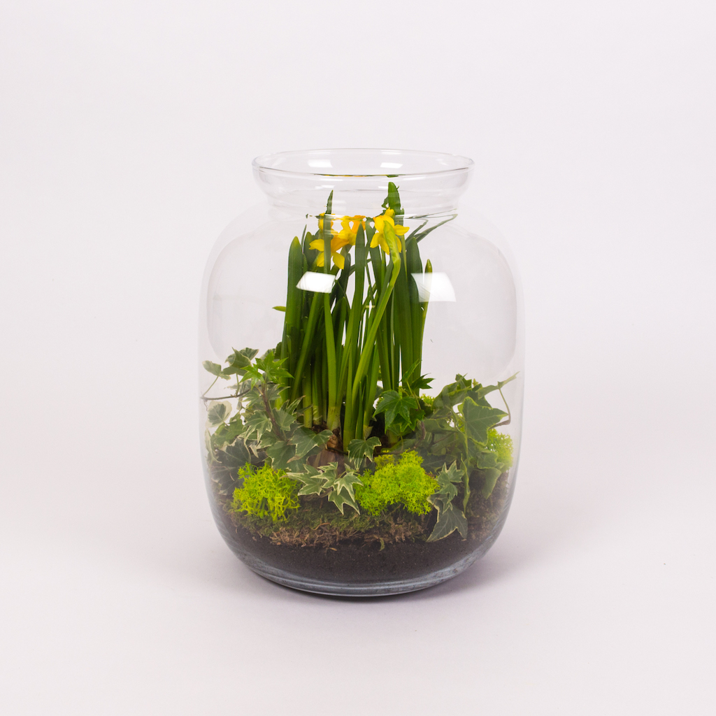Pretuim tot ce are natura mai bun si mai frumos de oferit, asadar am pregatit acest terariu special pentru tine sau cineva drag. Aranjamentele cu plante verzi si plante cu flori rezista mai mult si in plus, purifica aerul din casa sau biroul tau. Acest terariu cu bulbi de narcisa si iedera este cadoul perfect pentru iubitorii de plante.
