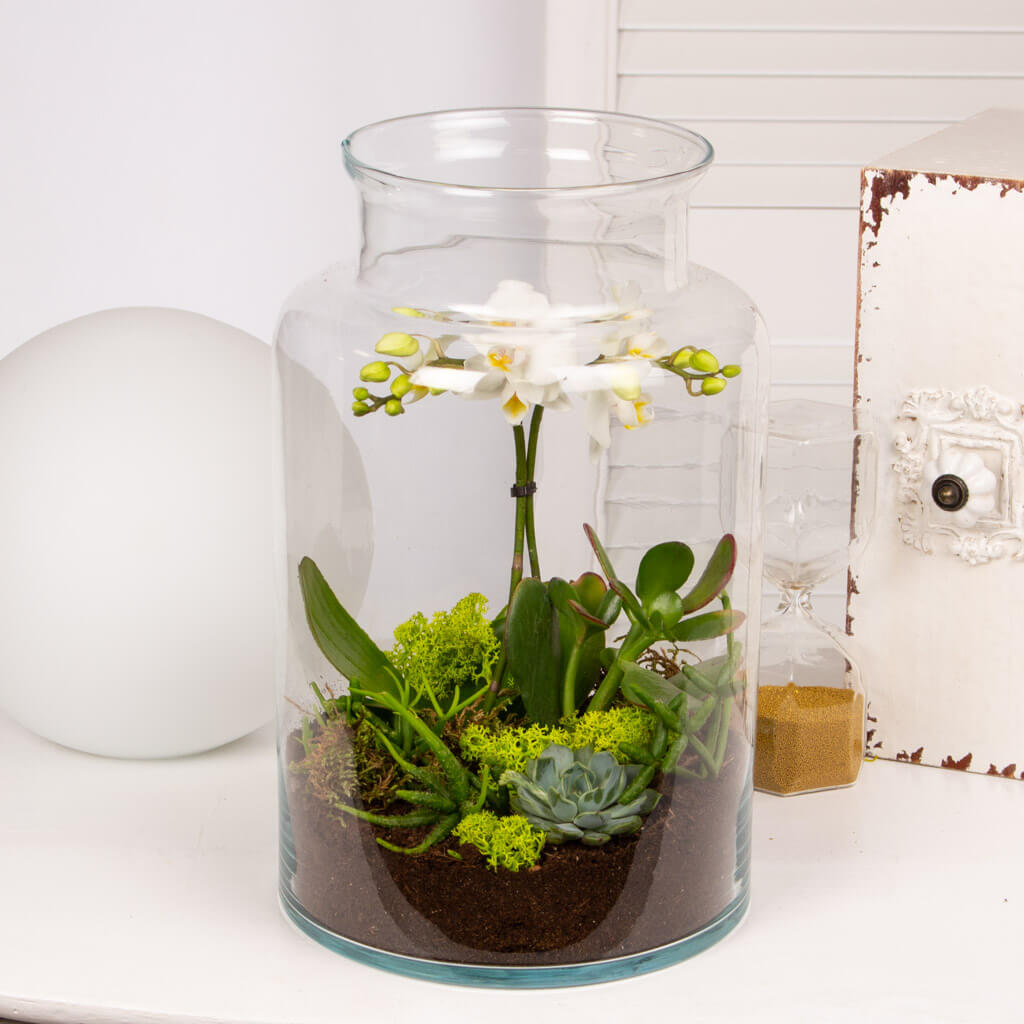 Pretuim tot ce are natura mai bun si mai frumos de oferit, asadar am pregatit acest terariu cu orhidee si plante suculente special pentru tine sau cineva drag. Aranjamentele cu plante verzi si plante cu flori rezista mai mult si in plus, purifica aerul din casa sau biroul tau. Acest terariu este cadoul perfect pentru iubitorii de plante.
