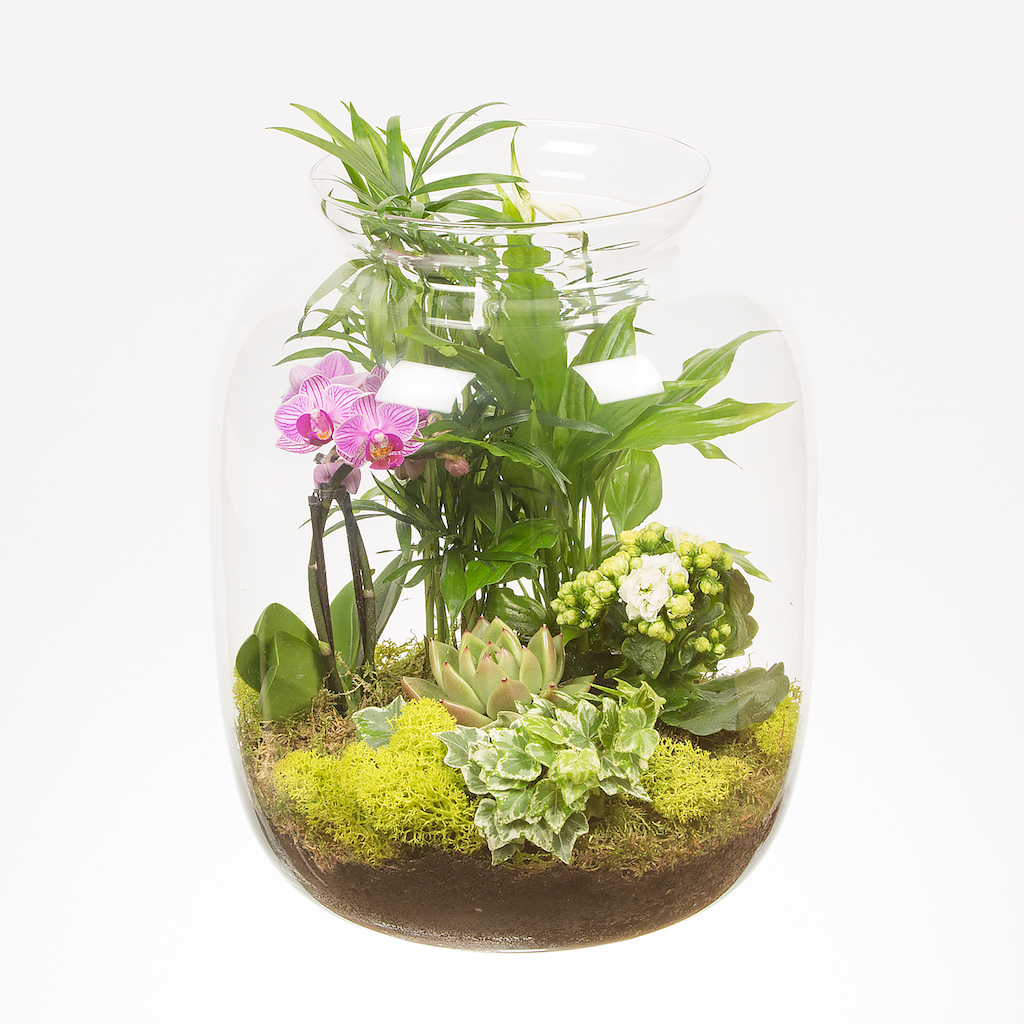 Vas de sticla, orhidee, kalanchoe si alte plante