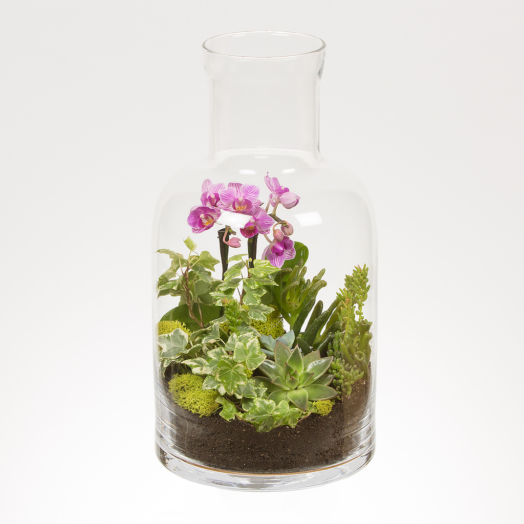 Terariu in vas de sticla cu phalaenopsis mica roz, iedera si alte plante de decor.