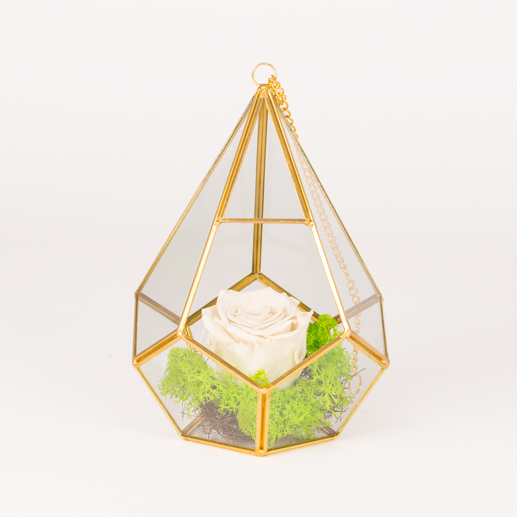 Prisma diamant L15cm h23cm cu trandafir conservat alb, muschi verde si cuib mic.