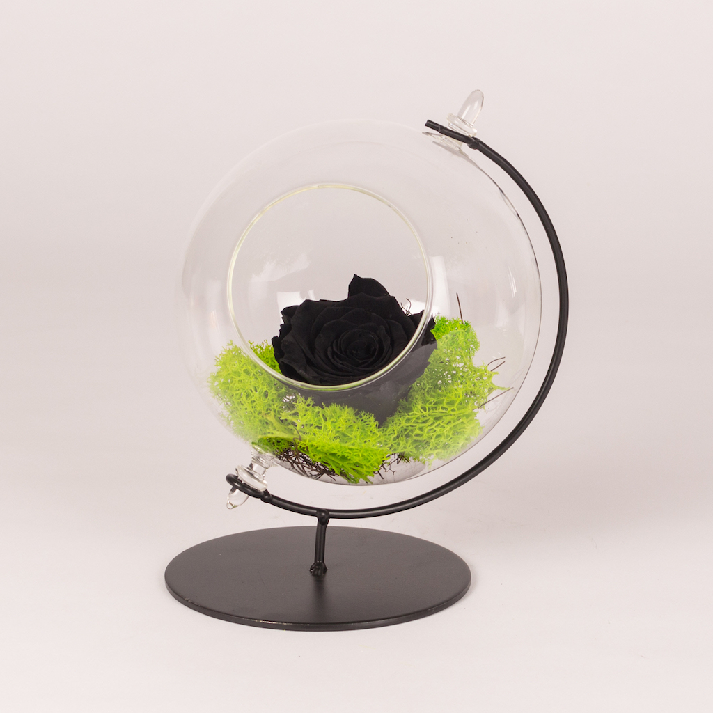Glob de sticla d16cm h20cm cu trandafir conservat negru, muschi verde