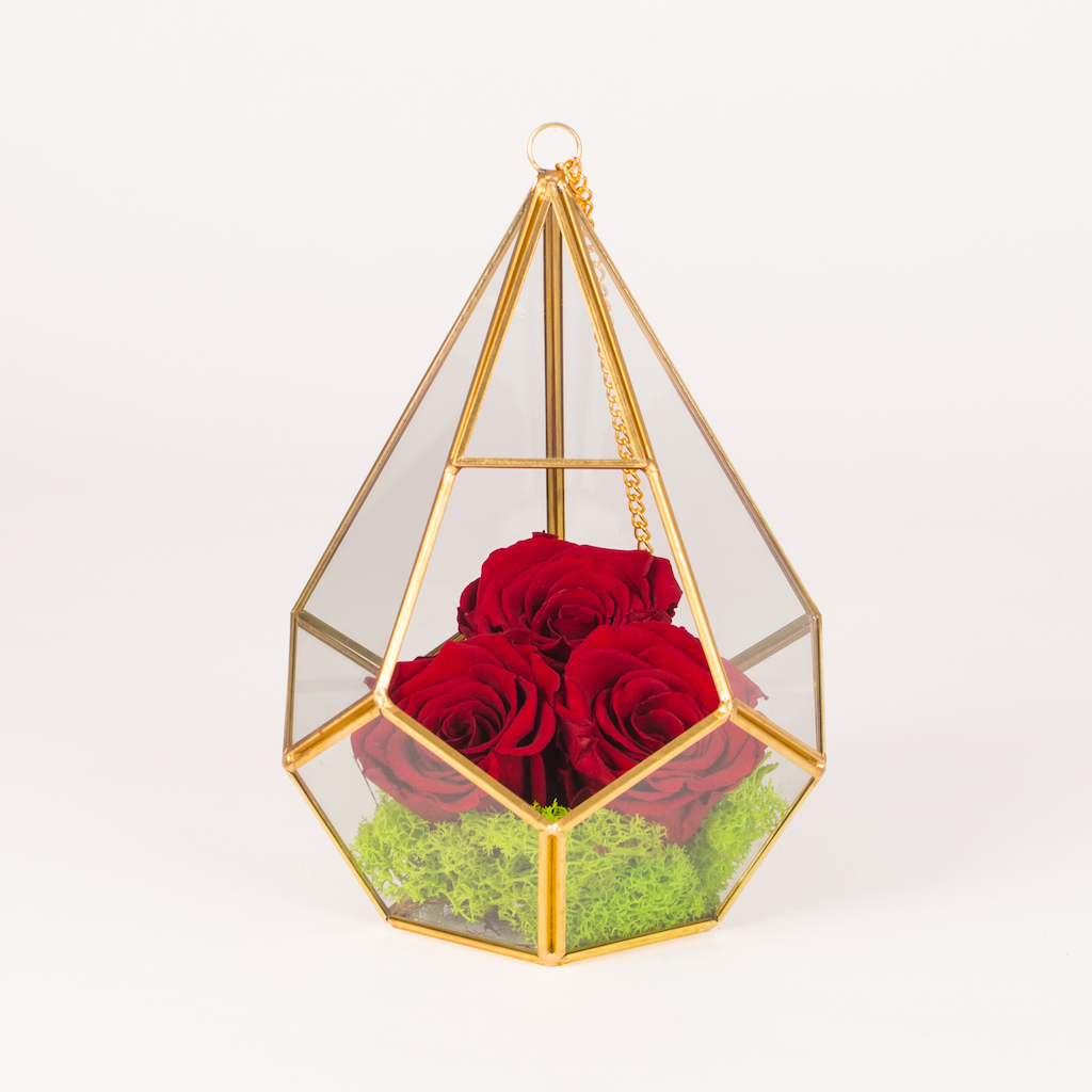 Prisma diamant L15cm h23cm cu 3 trandafiri conservati rosii, muschi verde si cuib mic.
