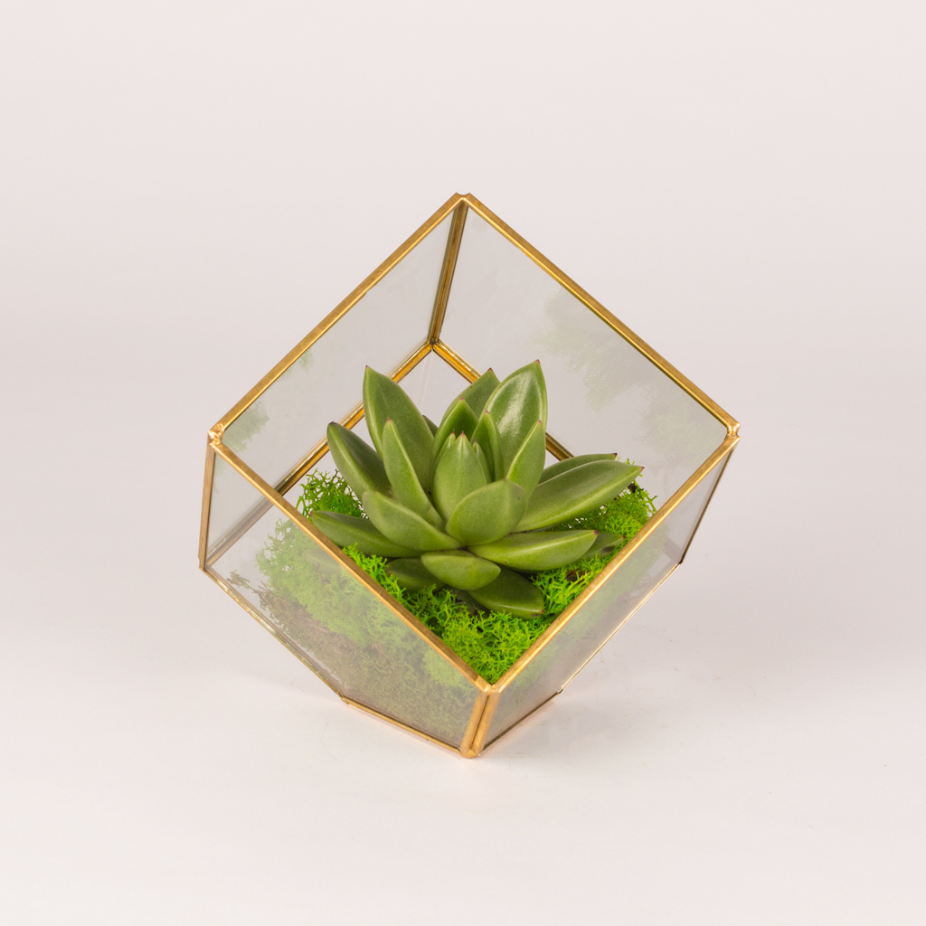 Terariu in cub cu planta echeveria verde si muschi verde.