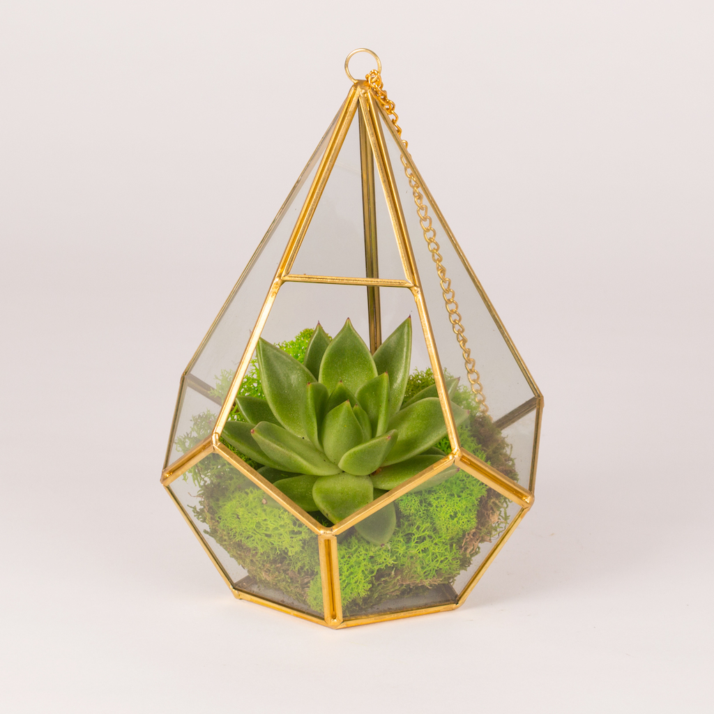 Terariu in prisma diaman cu planta echeveria verde si muschi verde.