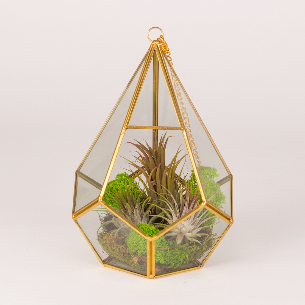 Terariu in prisma diamant cu 3 plante aerofita mici si muschi verde.
