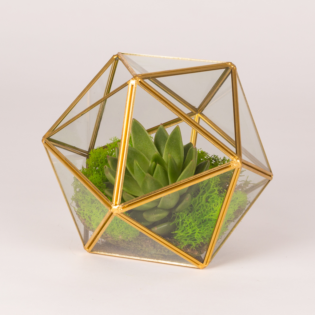 Terariu cu prisma sfera diam 20cm cu planta echeveria verde si muschi verde.