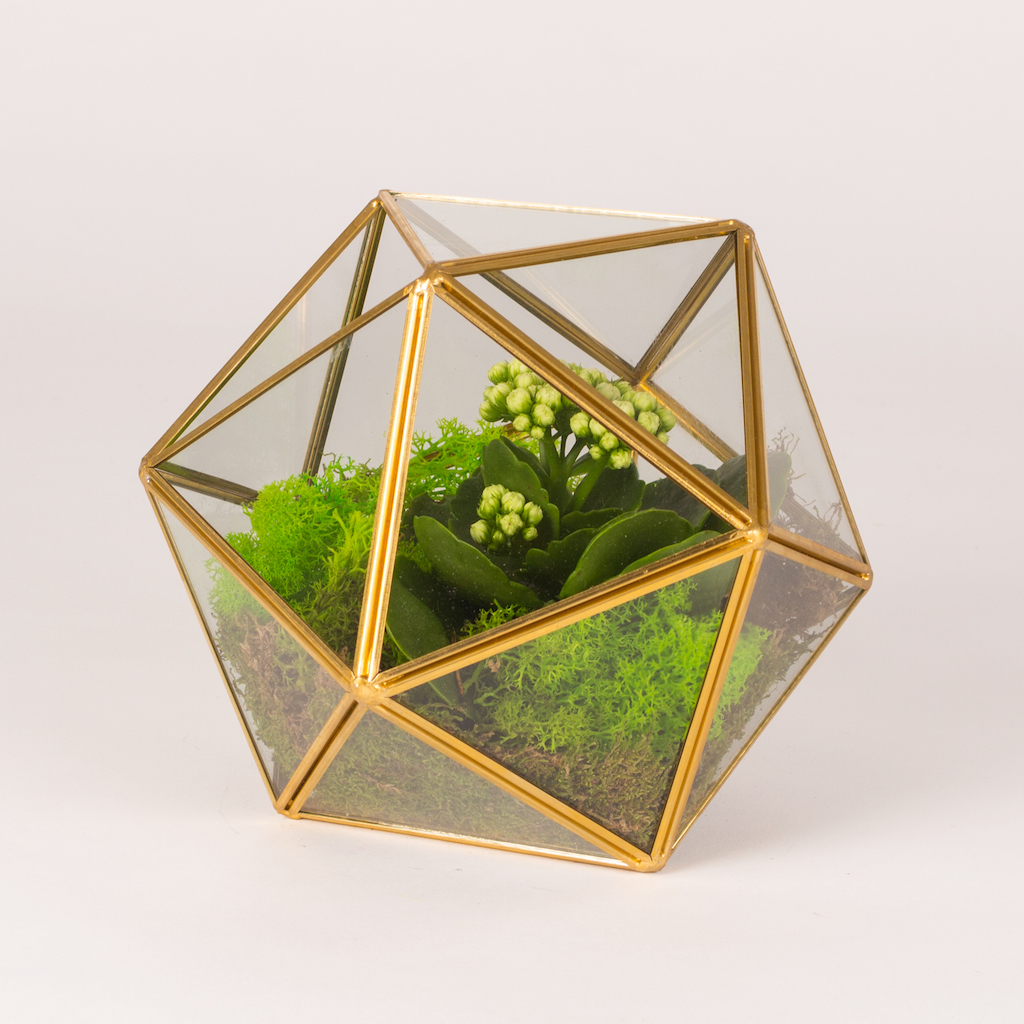Terariu in prisma sfera diam 20cm cu planta kalanchoe si muschi verde.