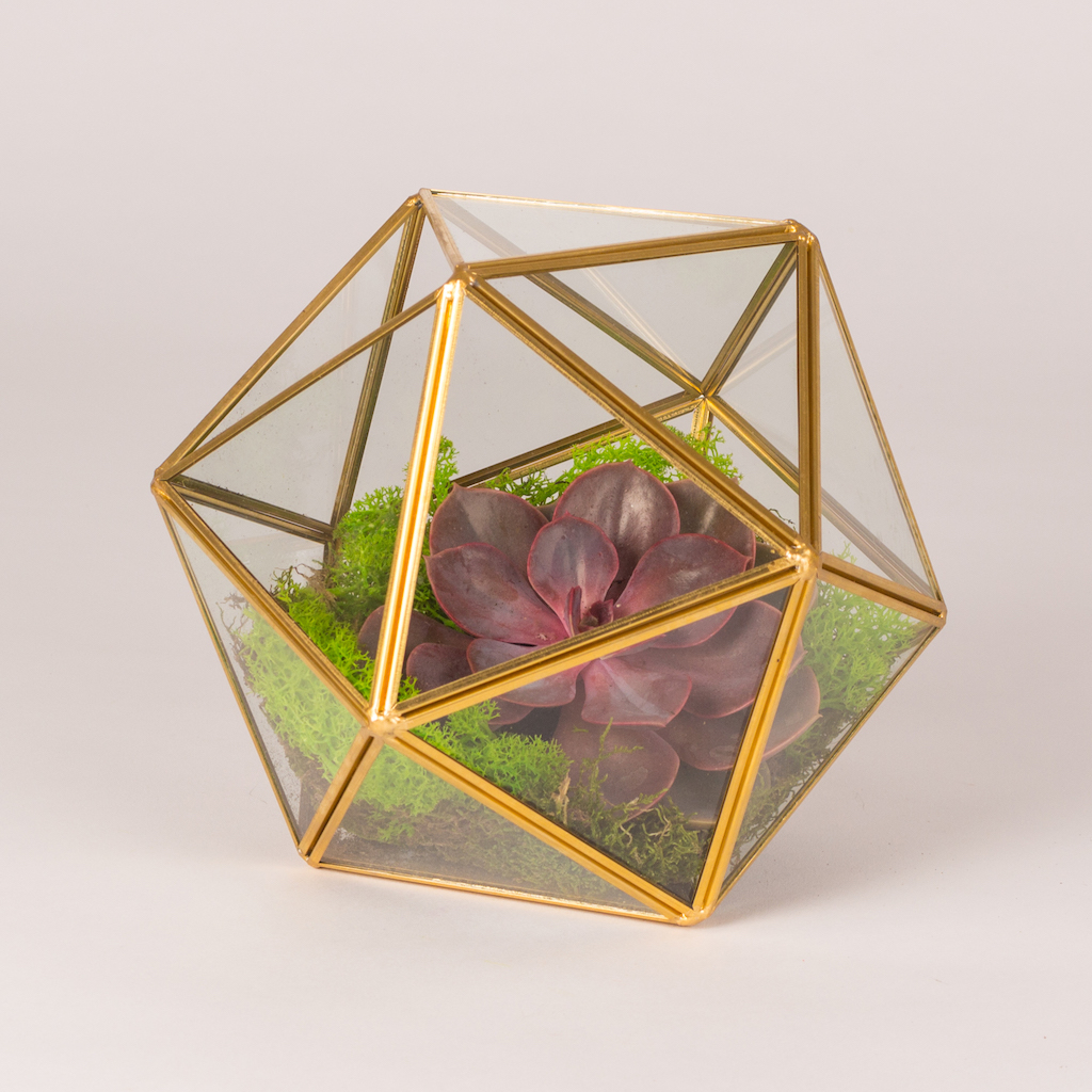 Terariu in prisma sfera diam 20cm cu planta echeveria rosie si muschi verde.