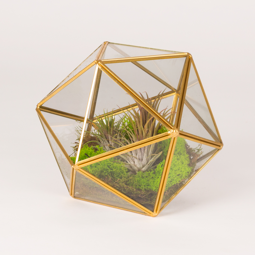 Terariu in prisma sfera diam 20cm cu 3 plante aerofita mici si muschi verde.