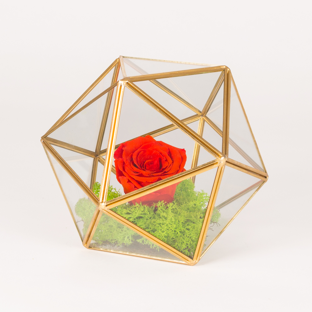 Prisma sfera diam20cm cu trandafir conservat portocaliu, muschi verde si cuib mic.